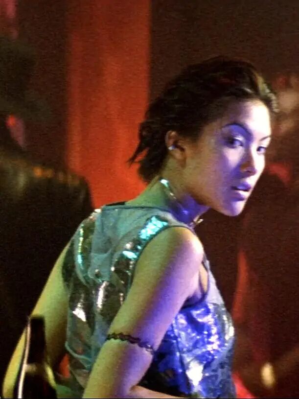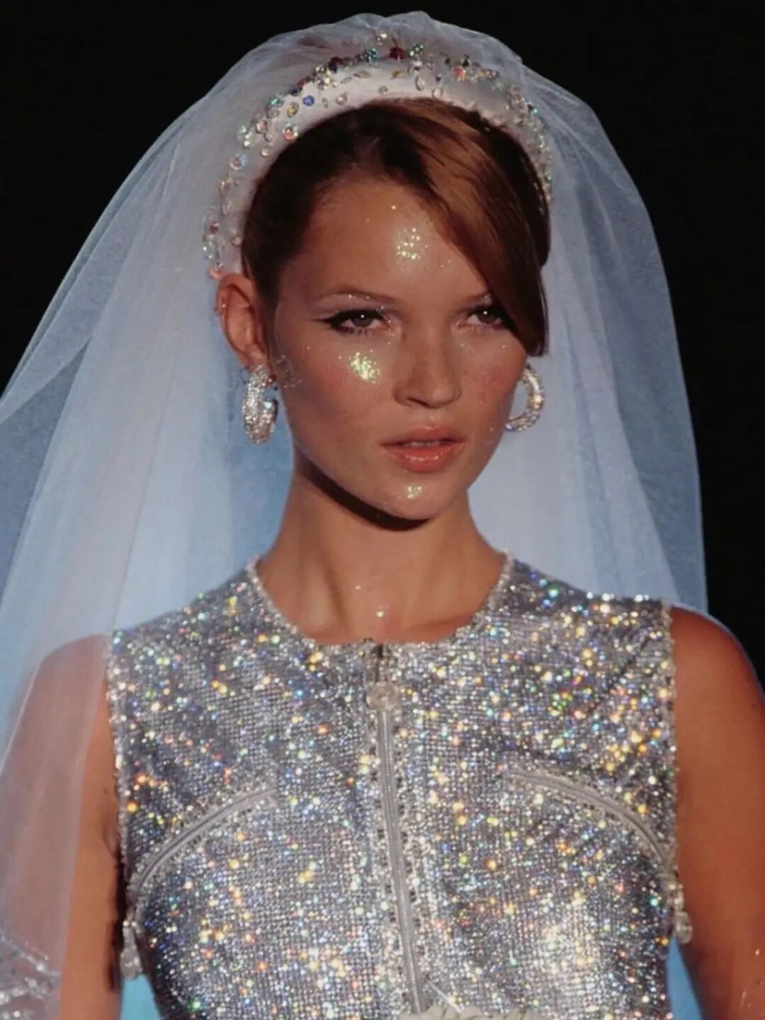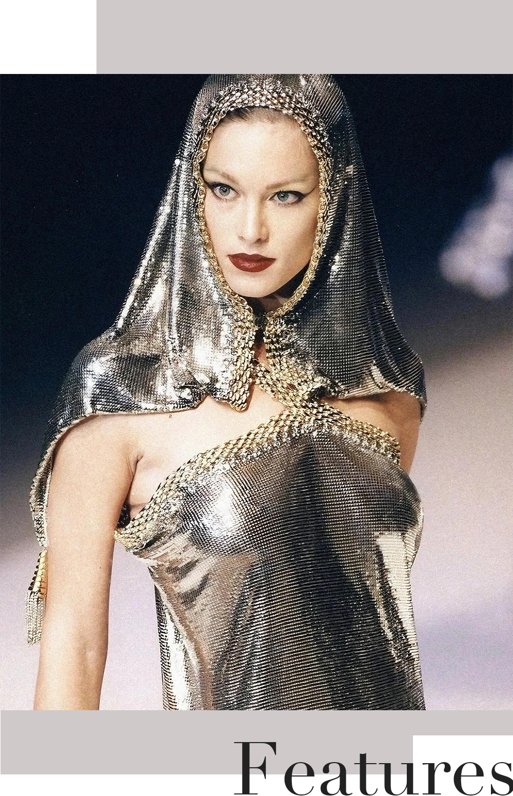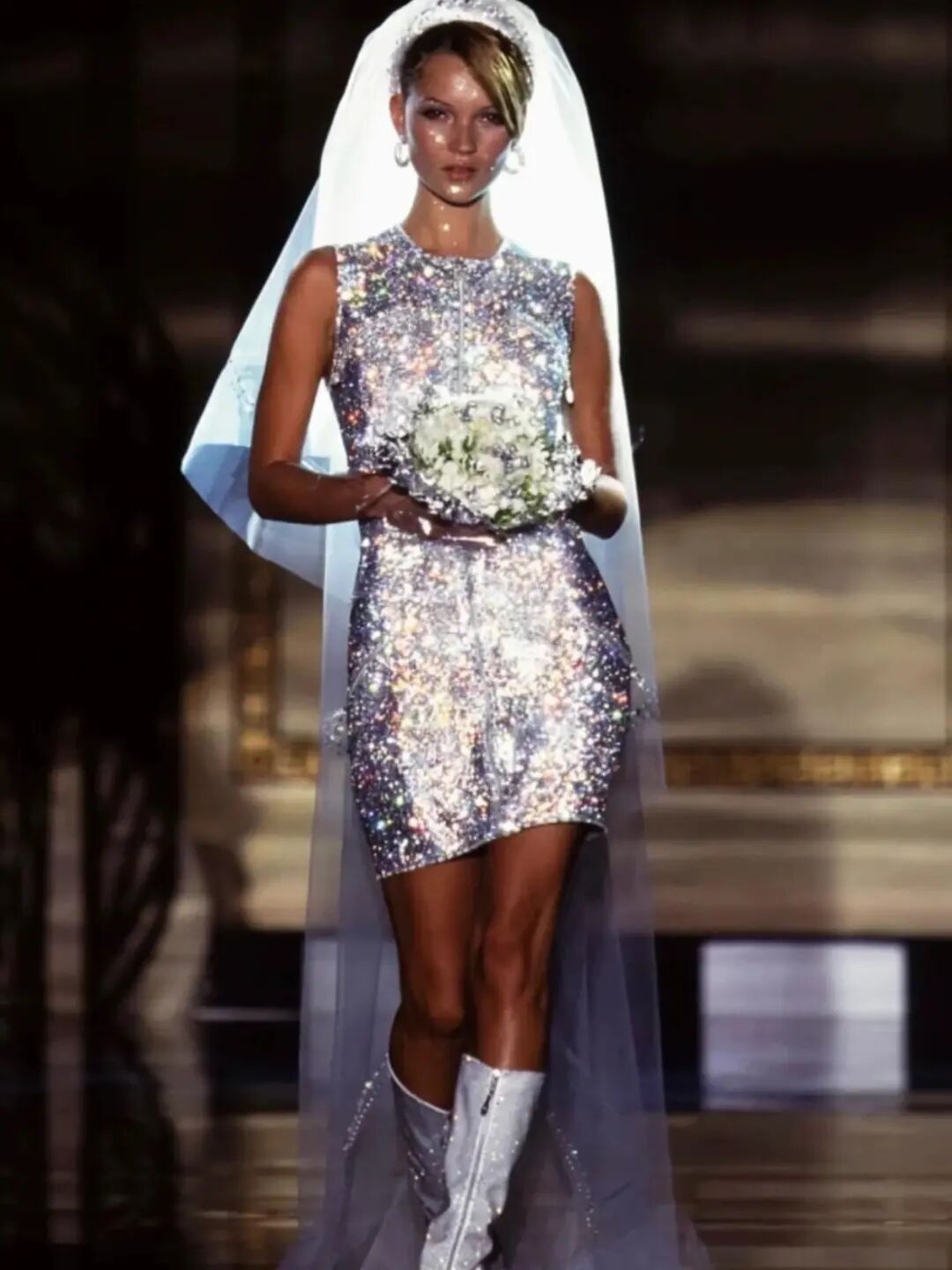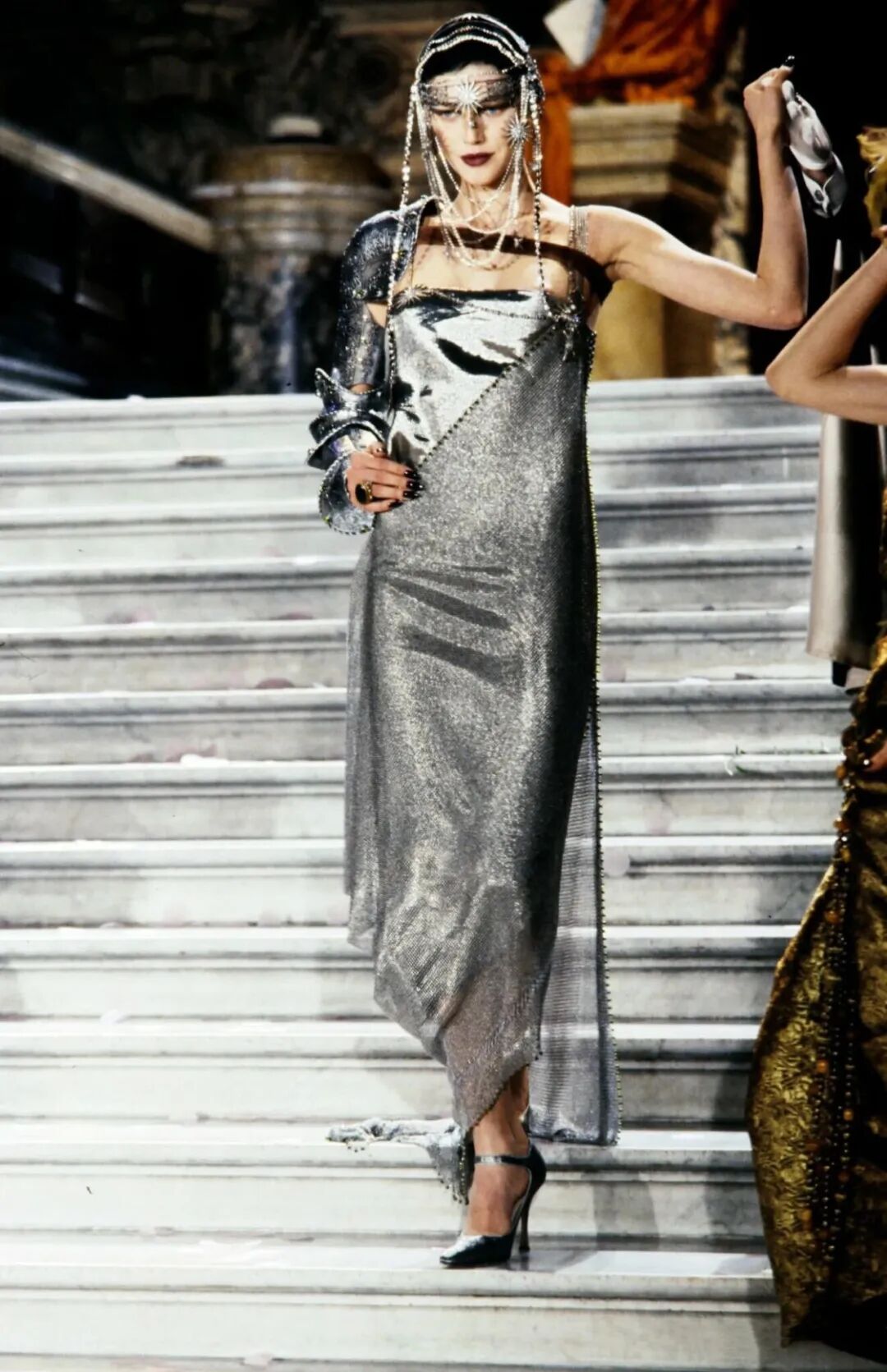Versace 1998秋冬成衣秀场上,吉赛尔·邦辰身着宛如银河碎片织就的银色华服登场。