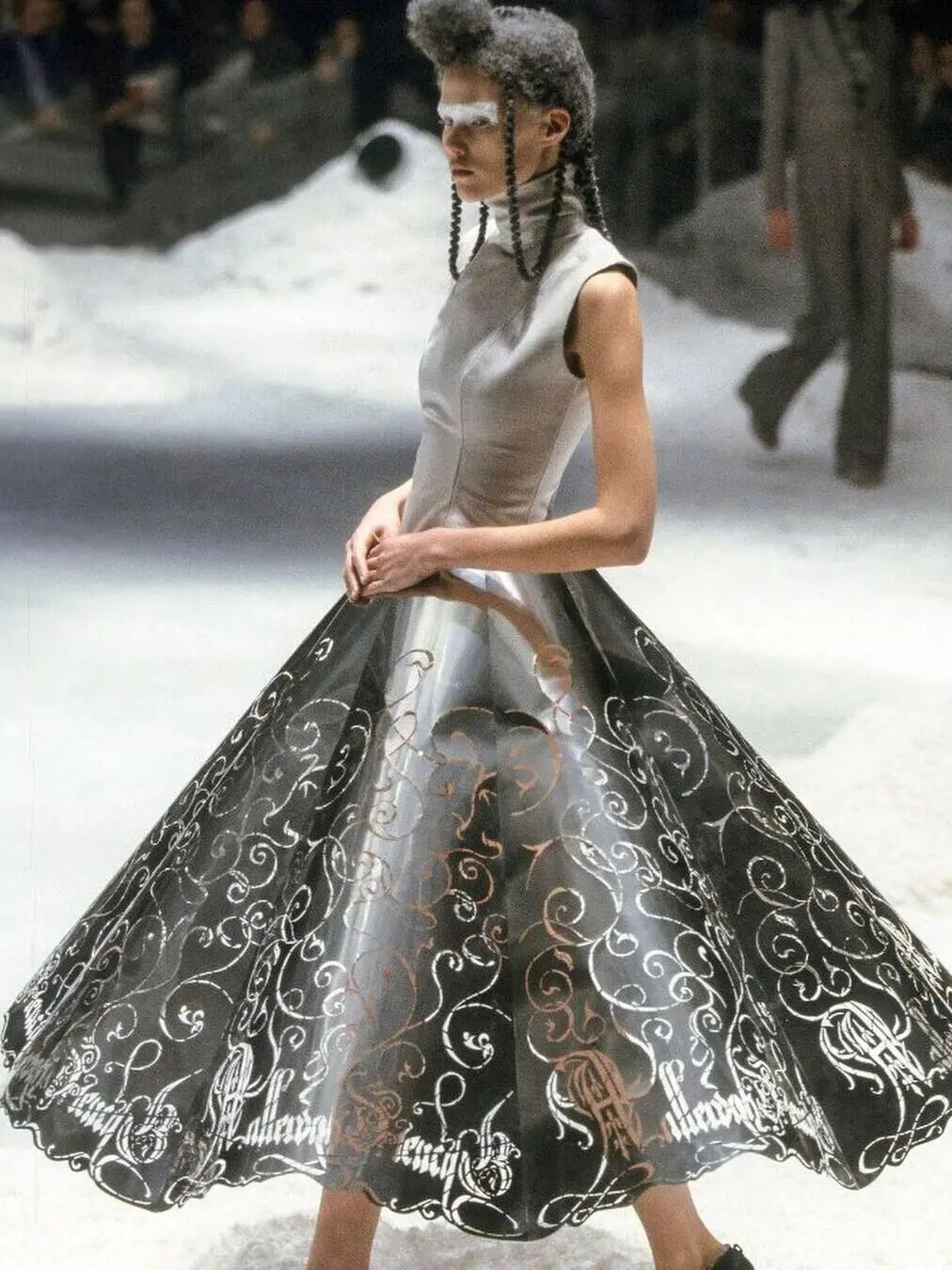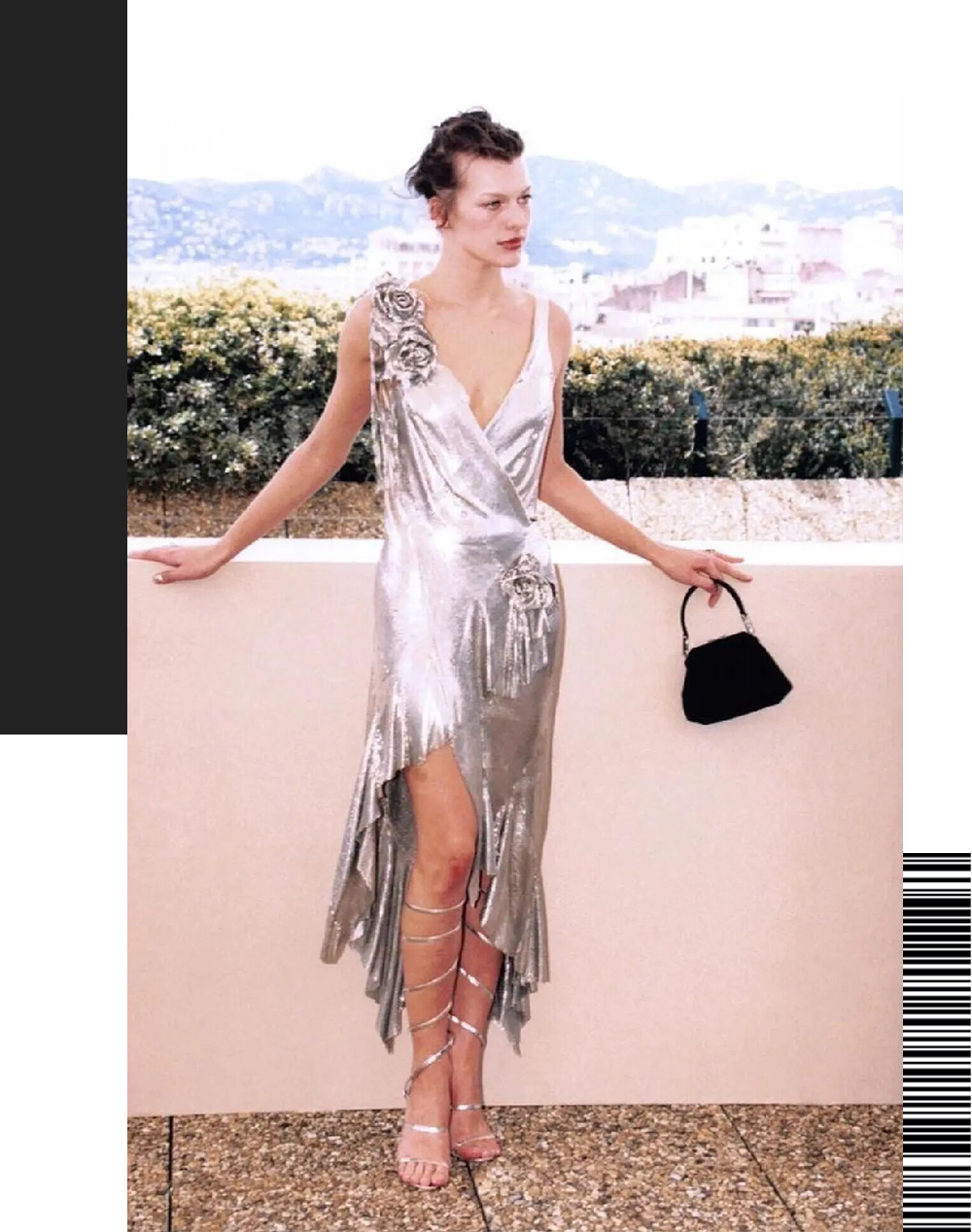 1997年戛纳电影节上,Milla Jovovich身着同年John Galliano的秋季成衣亮相,裙装的剪裁与光泽在镁光灯下流动闪烁,融合了浪漫主义与先锋设计。
