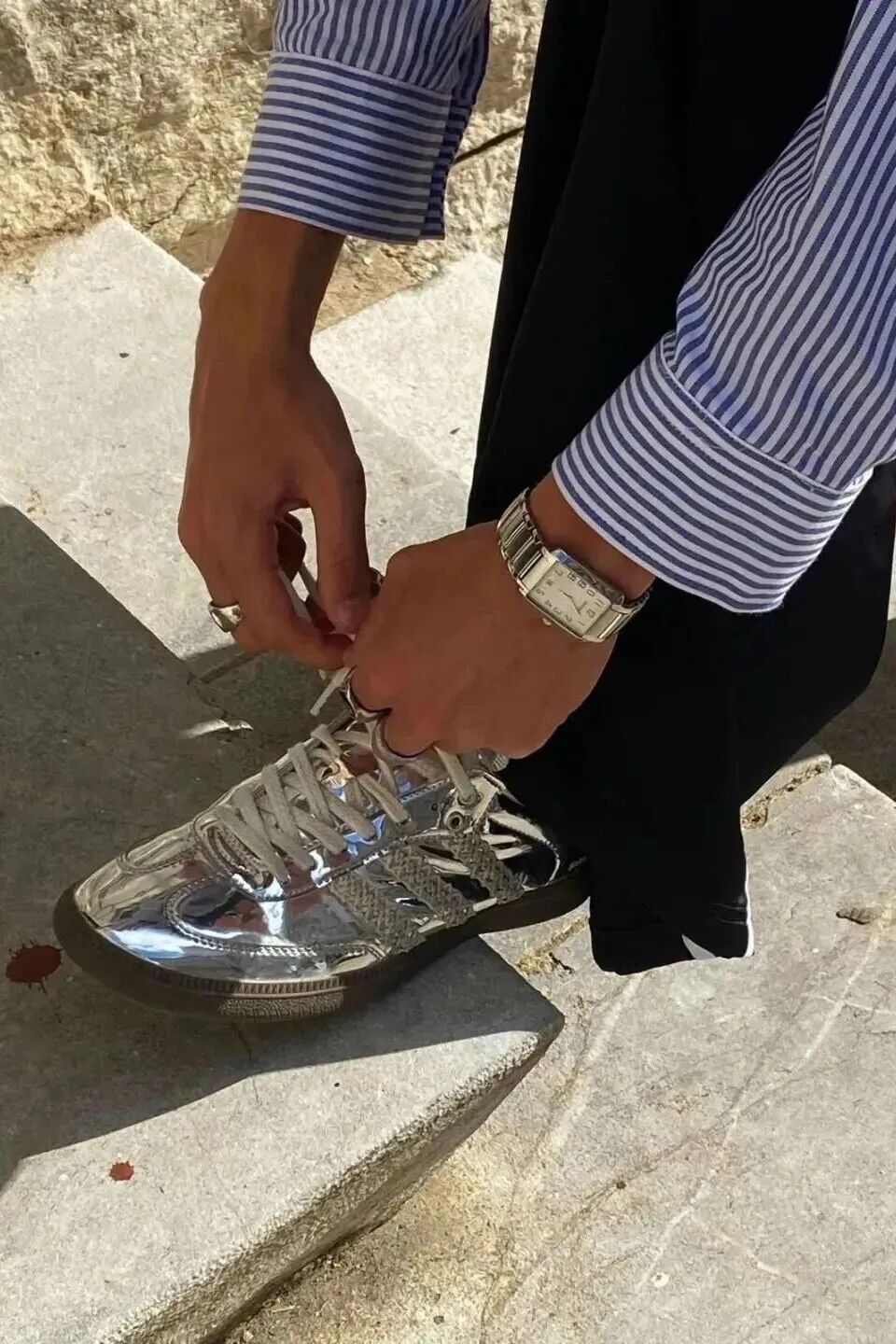 All silvery造型需要强大气场支撑,日常穿搭中保留一件银色单品作为焦点,哪怕是一双银色运动鞋,也足以让基本款造型变得不同。
