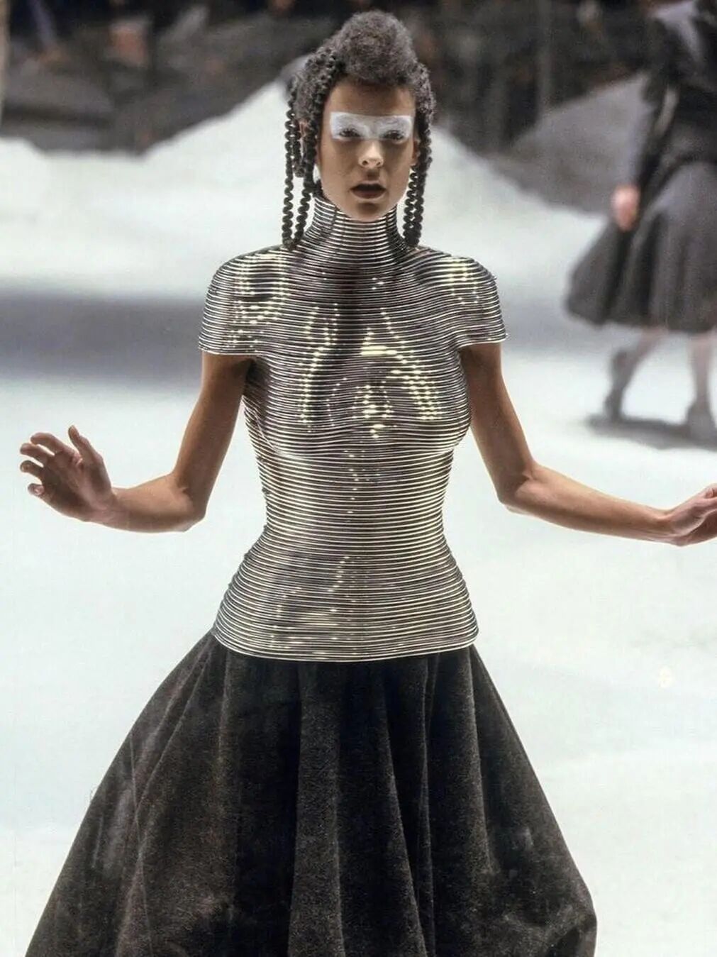 来自Christian Dior 1998春夏高定的银色抹胸长裙,秀场造型搭配的肩甲和头饰让这条如银河般的长裙有了力量之美。