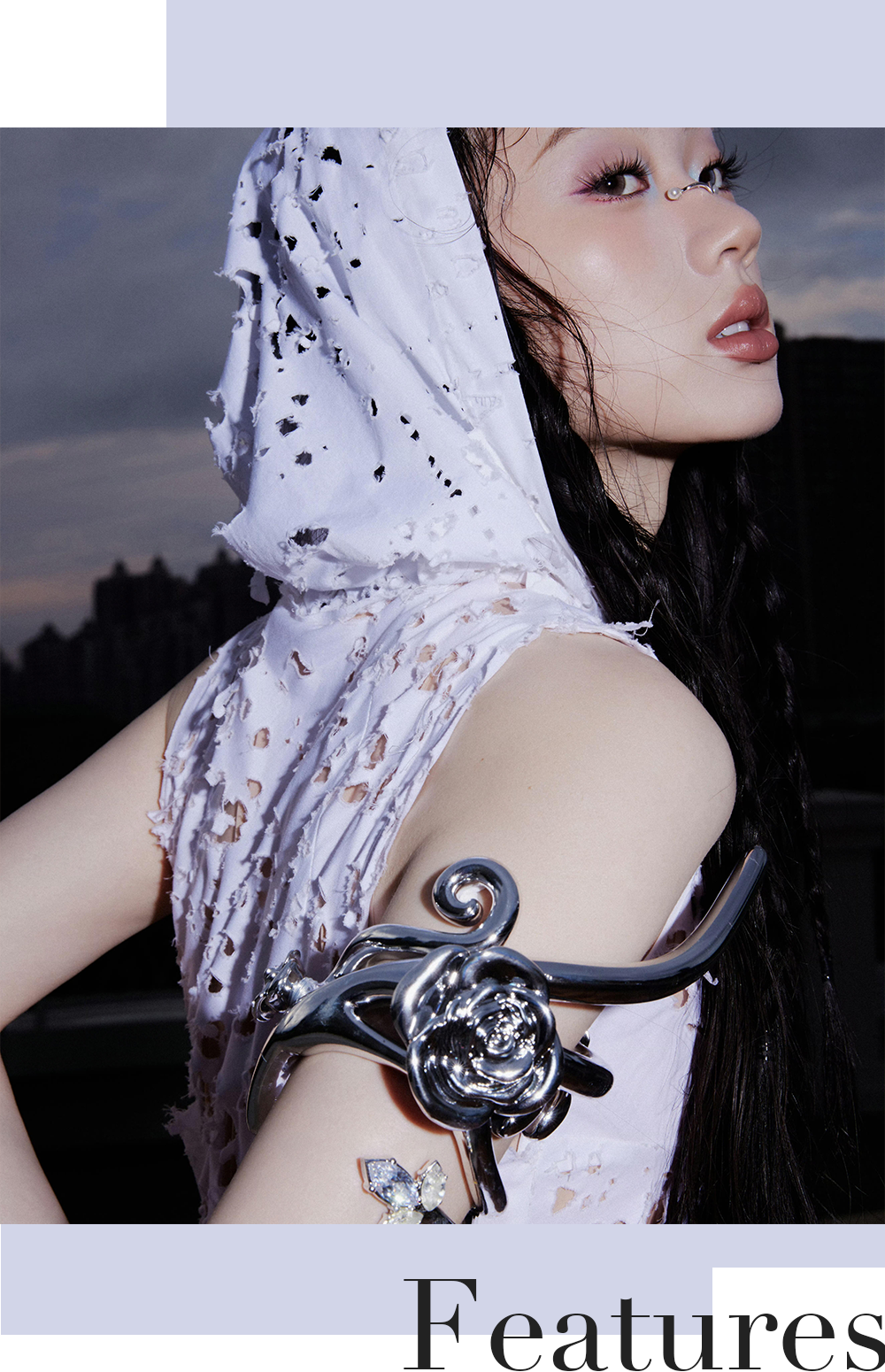 相较于未来主义的科幻先锋,银色长裙在克制的优雅中突显银色的精致本质。散发出的光芒却并非冰冷的机械之光,而是带有温度的高级与优雅。