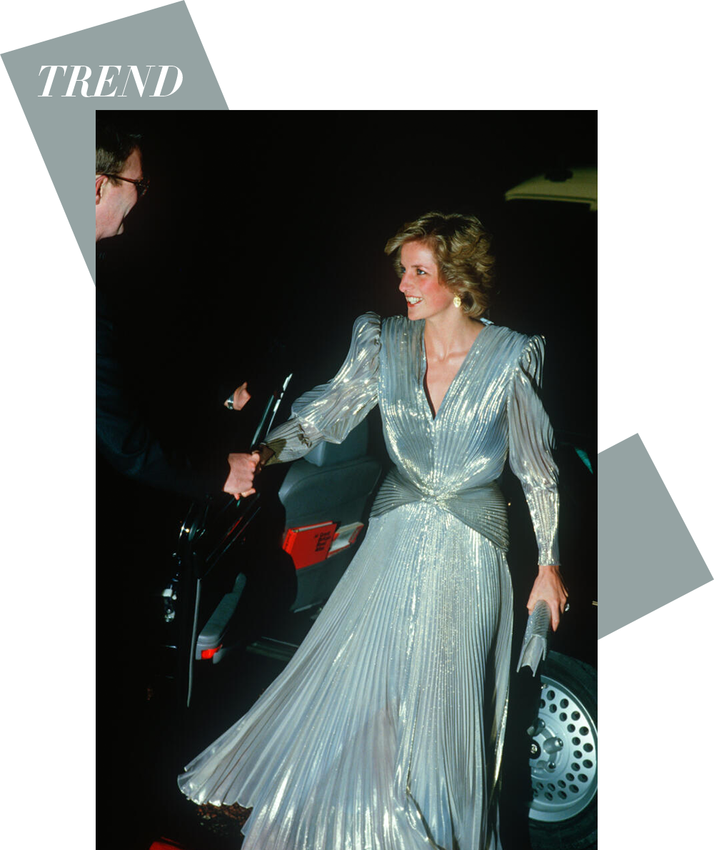 这件礼服出自服装设计师Bruce Oldfield,流光溢彩的质感加上标志性的宽肩廓形,与当时的热播剧《豪门恩怨(Dynasty)》中的人物打扮不谋而合,戴安娜也因此多了“Dynasty Di”这个绰号。