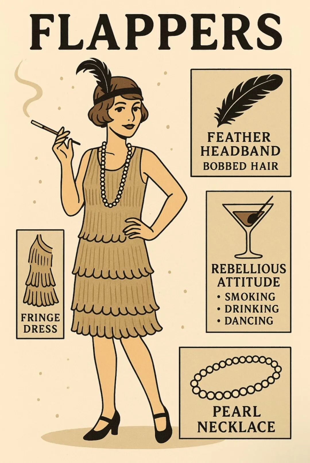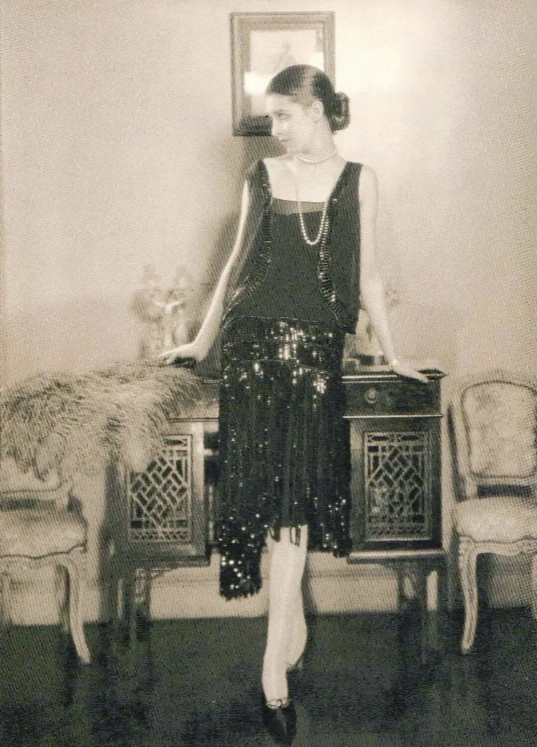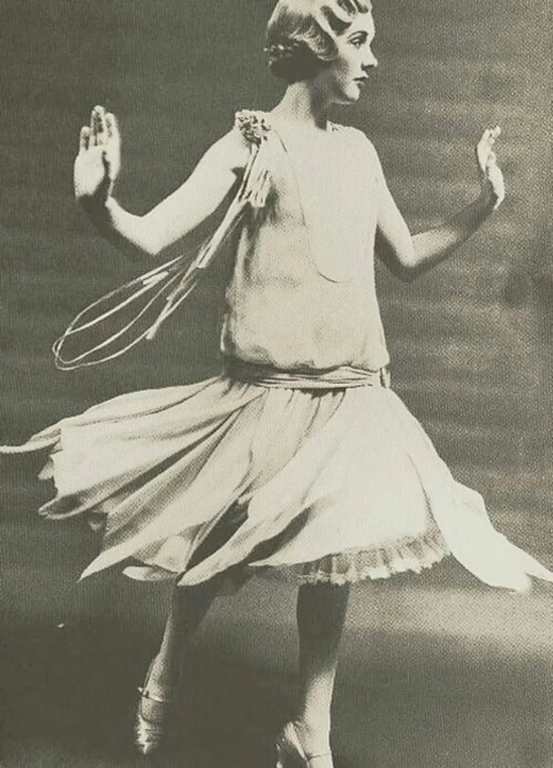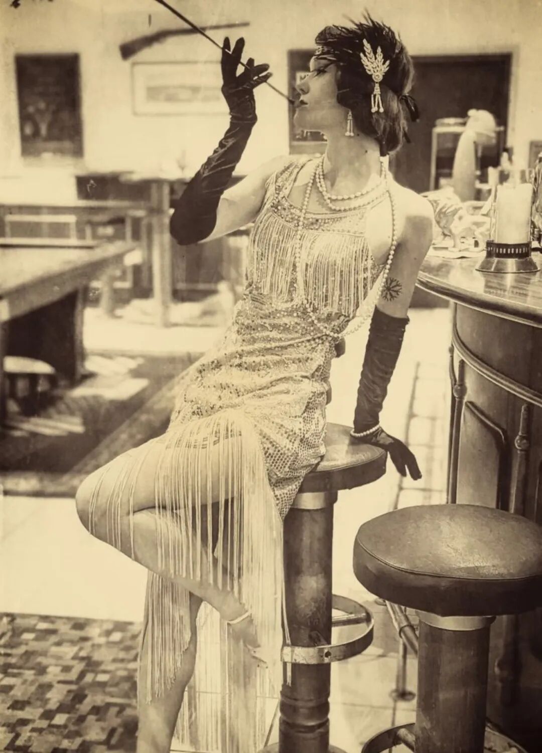 20世纪年代的flapper女郎(随意女郎),曾是那个时代最鲜明的文化符号之一,她们穿着宽松直筒的低腰连衣裙,甩掉了束腰和繁复的裙摆,像男人一样喝酒、工作,并敢于自我表达,以短发、香烟与爵士乐,向社会发出关于女性独立与自由的强烈宣言。