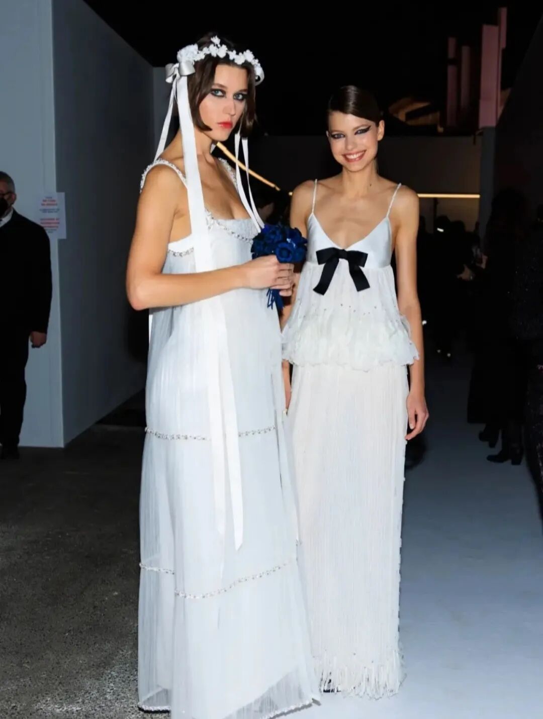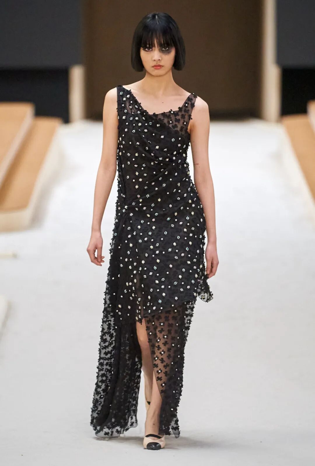 在香奈儿2022年春夏高定大秀中,短款摆动裙利用渐变羽毛、流速、闪珠等元素制作装饰,整体造型带有强烈的flapper血统。2022春夏的Couture秀,Chanel不仅有流苏,还结合几何印花、drop waist(腰线下落)以及若干夜礼服让身体线条松弛,弱化传统腰线,和flapper的美学呼应。