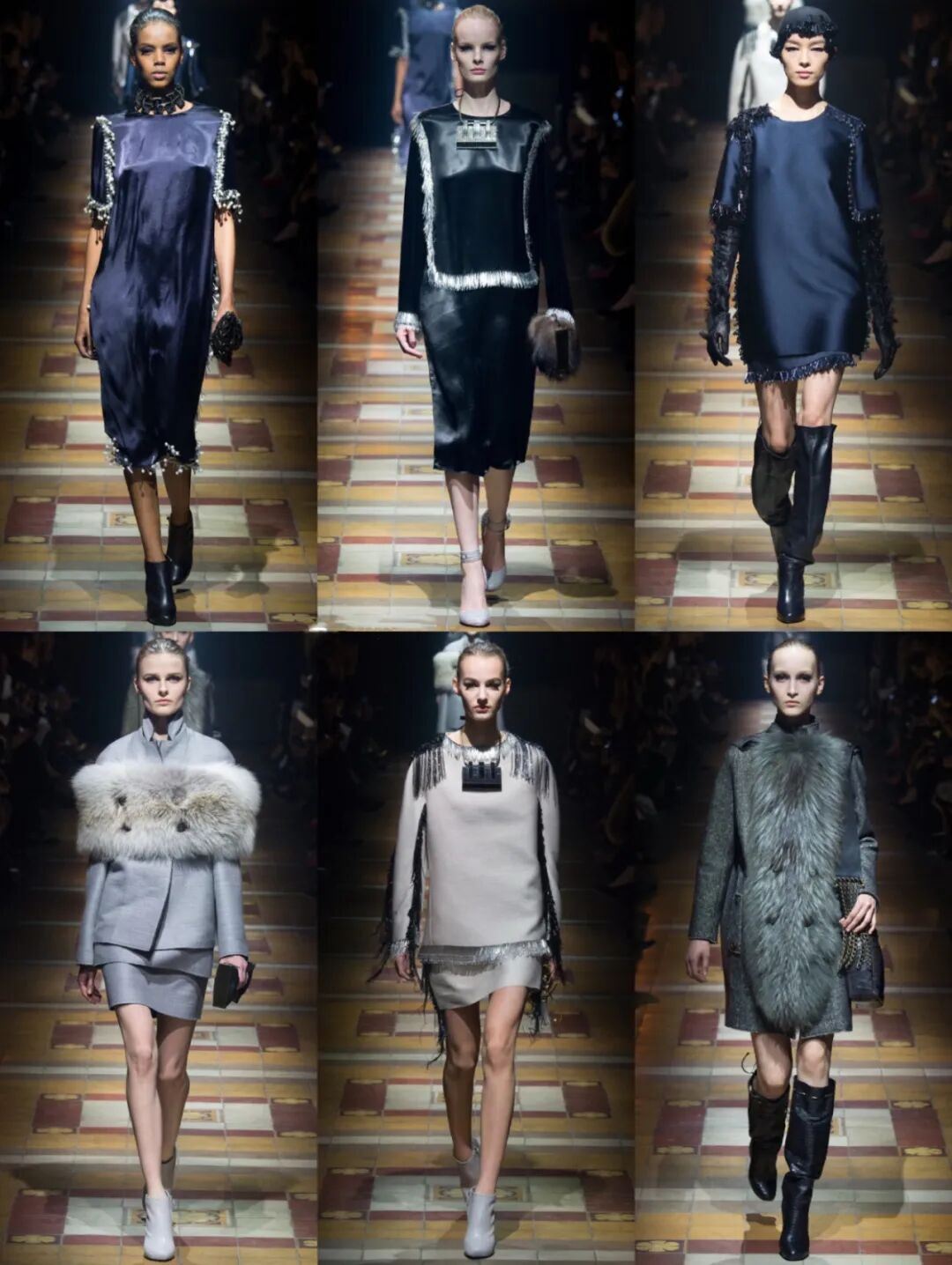 Lanvin在2014-2015秋冬系列中以众多羽毛、流苏细节,以及1920年代风格的落肩长手套贴近flapper的颤动装饰裙款式。