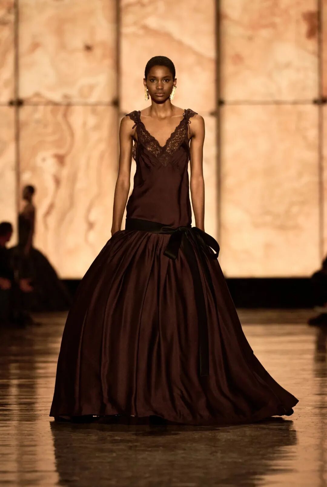 Saint Laurent 2025春夏秀场中的黑低腰连衣裙完成了低腰线的再一次变奏,设计师在低腰线之下将大裙摆铺陈开来,绸缎、蕾丝、蝴蝶结的加入让裙装多了几丝妩媚与柔软。