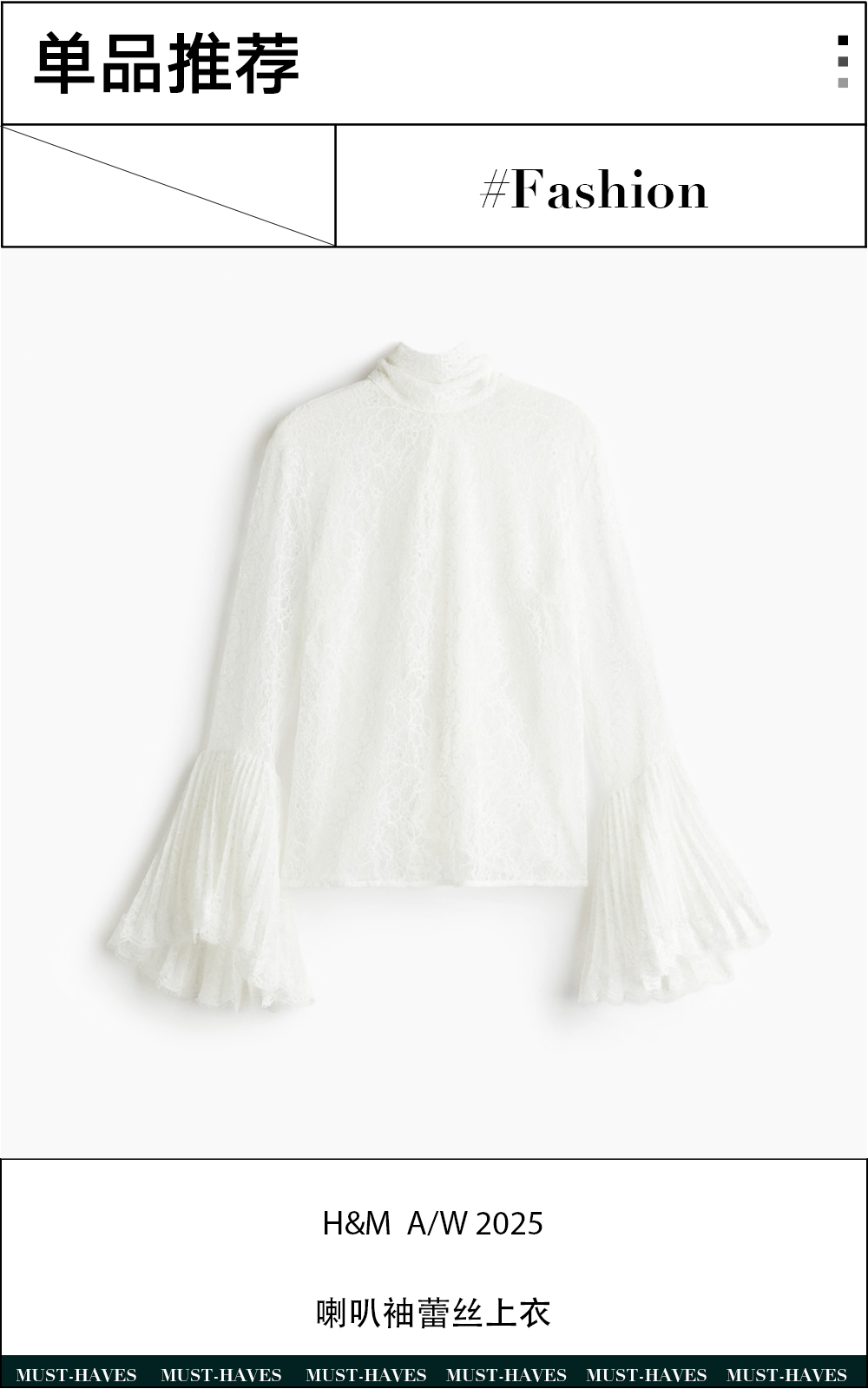 H&M 2025秋冬系列这款喇叭袖蕾丝上衣在设计上采用垂褶立领,长系带搭配背面水滴形开口增添灵动感,喇叭袖口的褶裥和薄纱在穿搭上更便于搭配出层次。