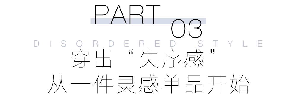 每个失序感衣橱都有一件难以定义的单品:可能是一件既是连衣裙又可作为外套的披风式设计,或是一条半身裙却有着裤装细节的款式。这件单品将成为你穿搭的灵感起点,其他衣物都围绕它展开。