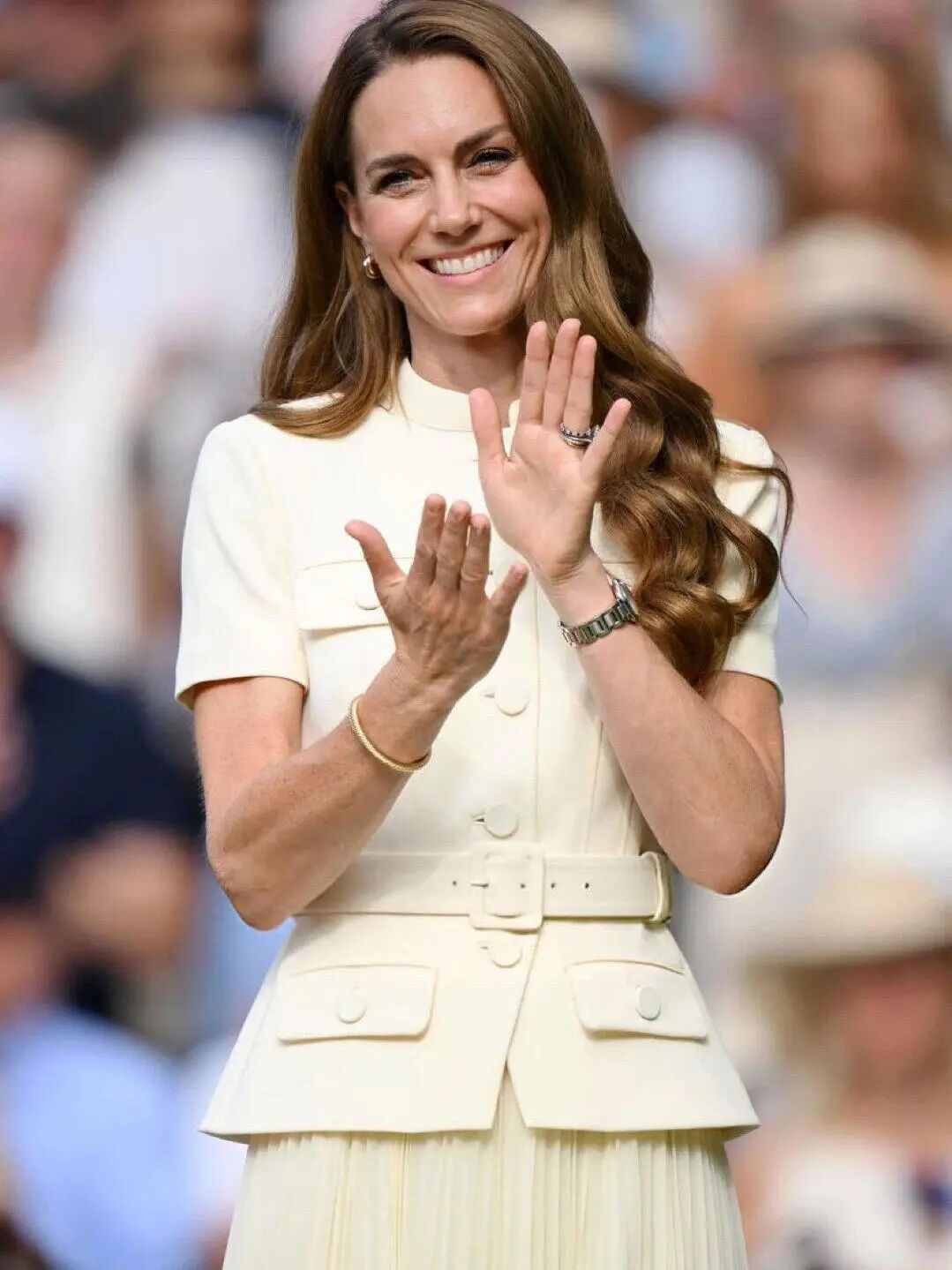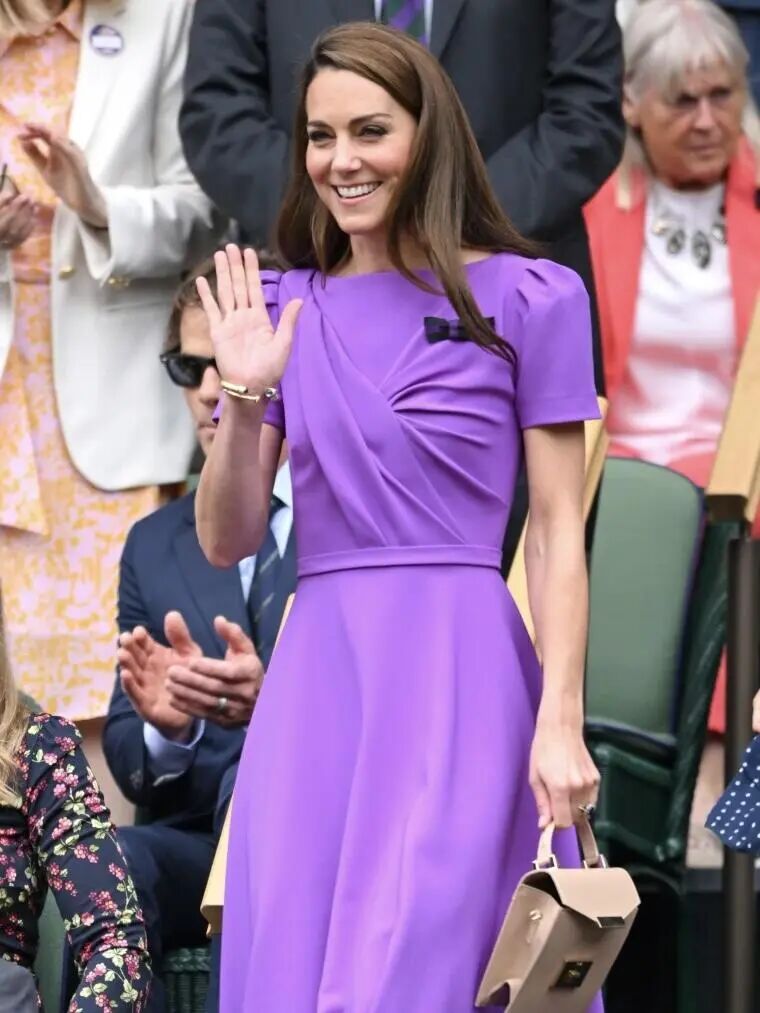 当然,网球场的优雅从不局限于白色。凯特王妃每次的亮相都给温网带来了更多典雅、贵气的色彩。今年女单决赛上,她一袭淡黄色套装温婉亮相,用清新柔和的色调诠释了夏日的轻盈与明亮;而去年的颁奖典礼上,那身与紫色蝴蝶结胸针巧妙呼应的紫色Cecilia连衣裙,则更显典雅明艳,为绿茵赛场注入一抹高贵气息。