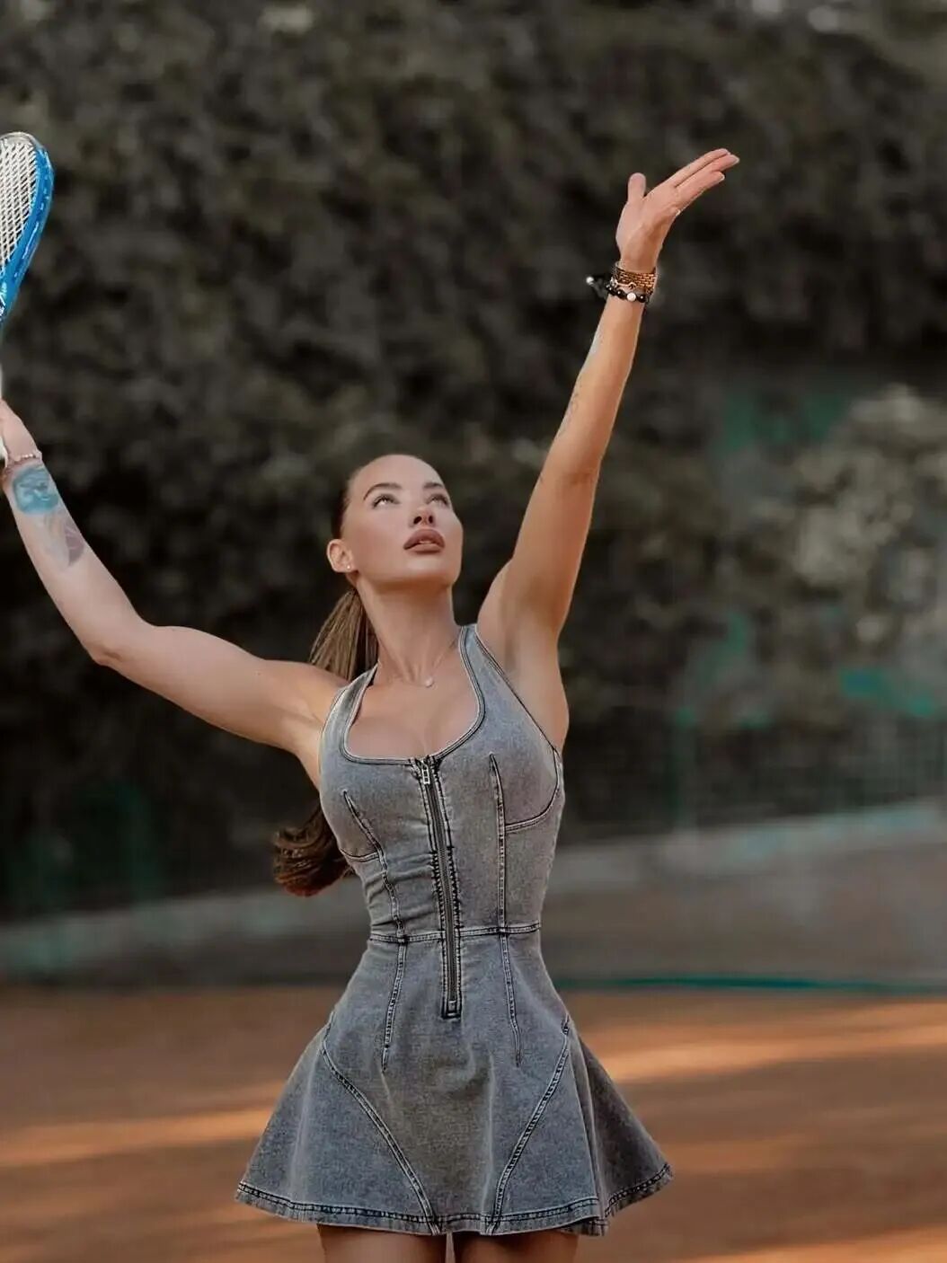 仿牛仔面料的网球风连衣裙辣妹们可以大胆尝试,打破了传统牛仔的硬朗印象,借弹力属性贴合身体曲线,浅灰调自带休闲松弛感,日常与球场场景随意切换,轻松打造出一种随性却不失精致的时髦态度。