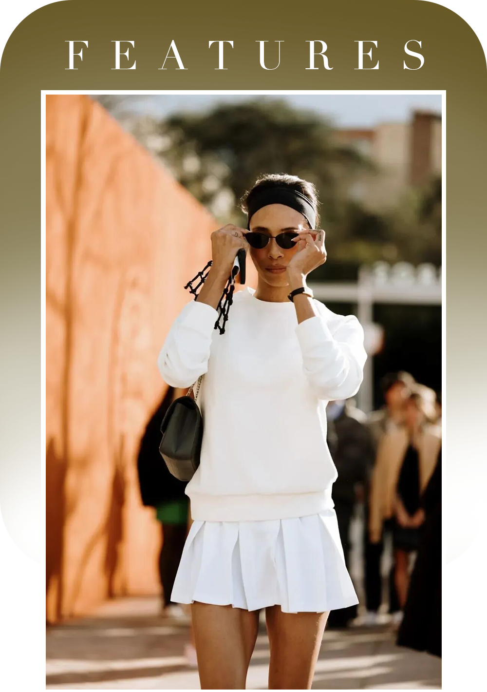 Bella的这组街拍曾经让多少女孩为小白裙买单!All white网球裙样式简单但勾勒出流畅的身体曲线,裙摆的蕾丝花边和侧面的小开衩增添了几分恰到好处的精致和性感,发带、墨镜和首饰的加入将复古运动风演绎得慵懒又高级。