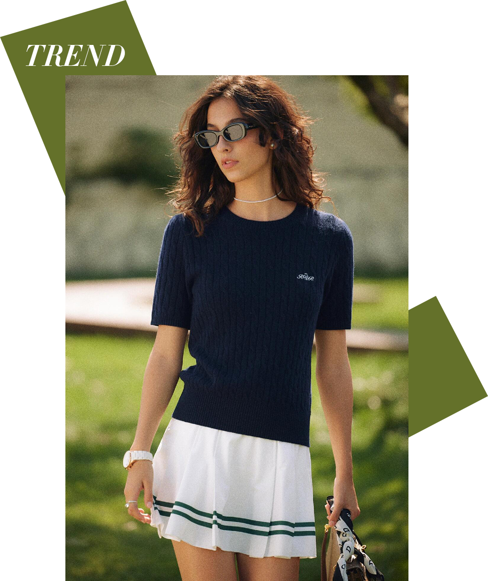 早在Tenniscore风潮席卷之前,Miu Miu 2022夏季的“Tennis Club”系列便已提供了教科书式示范。将网球元素与标志性的学院风融合,呈现出精英感十足的“网球预科生风格”。