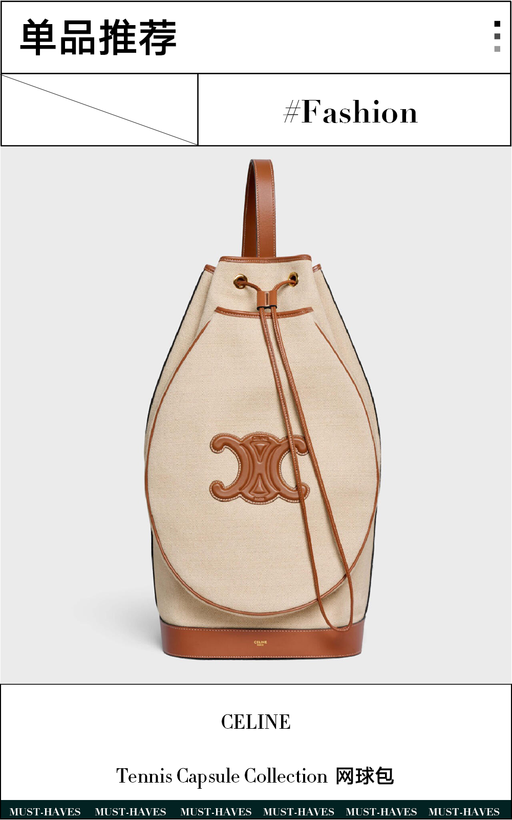 这款帆布单肩包巧妙融合了水桶包的时尚廓形与网球拍套的功能基因。其宽敞的内部空间不仅能轻松容纳球拍及相关装备,更以利落线条成为造型亮点。无论是用于运动休闲还是日常出行,都显得精致而不失活力。