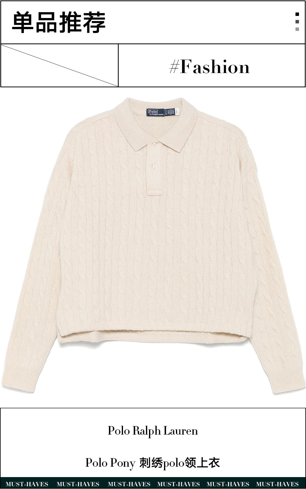 这件绞花针织polo领上衣,以浅米色羊绒材质演绎经典学院风格。精湛的绞花针织纹理与柔软质感相得益彰,正面竖排纽扣与罗纹边饰勾勒出利落轮廓,落肩设计与略长的后摆营造出轻松慵懒的韵味。