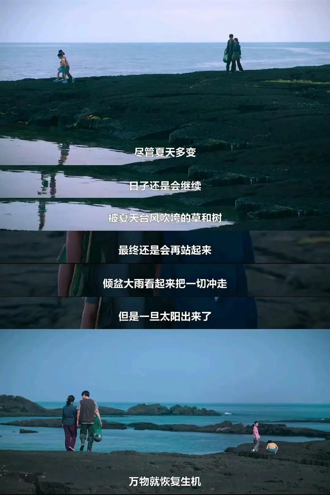 “被夏天台风吹垮的草和树,最终还是会再站起来。倾盆大雨看起来把一切冲走,但是一旦太阳出来了,万物就恢复生机。”
