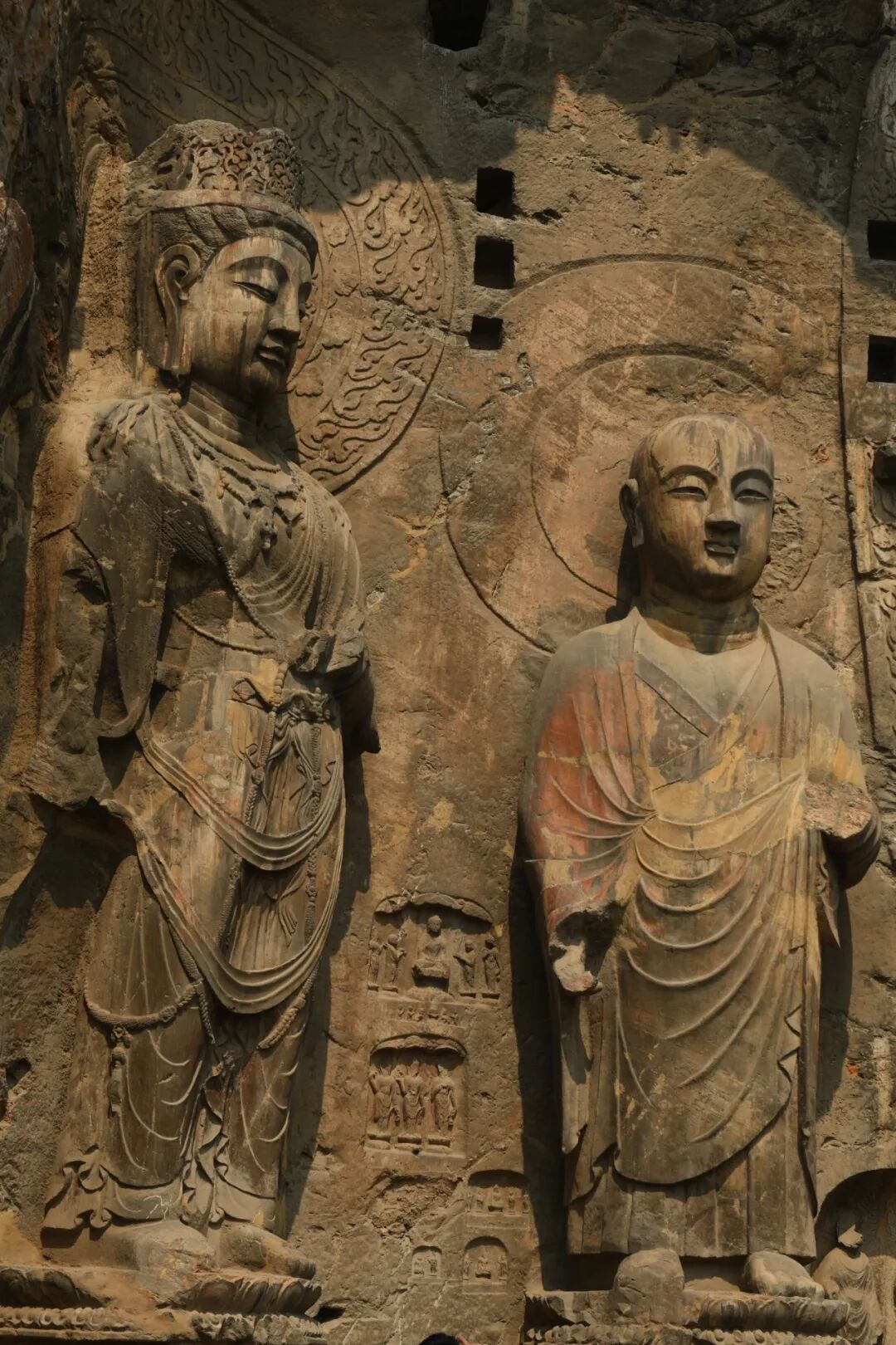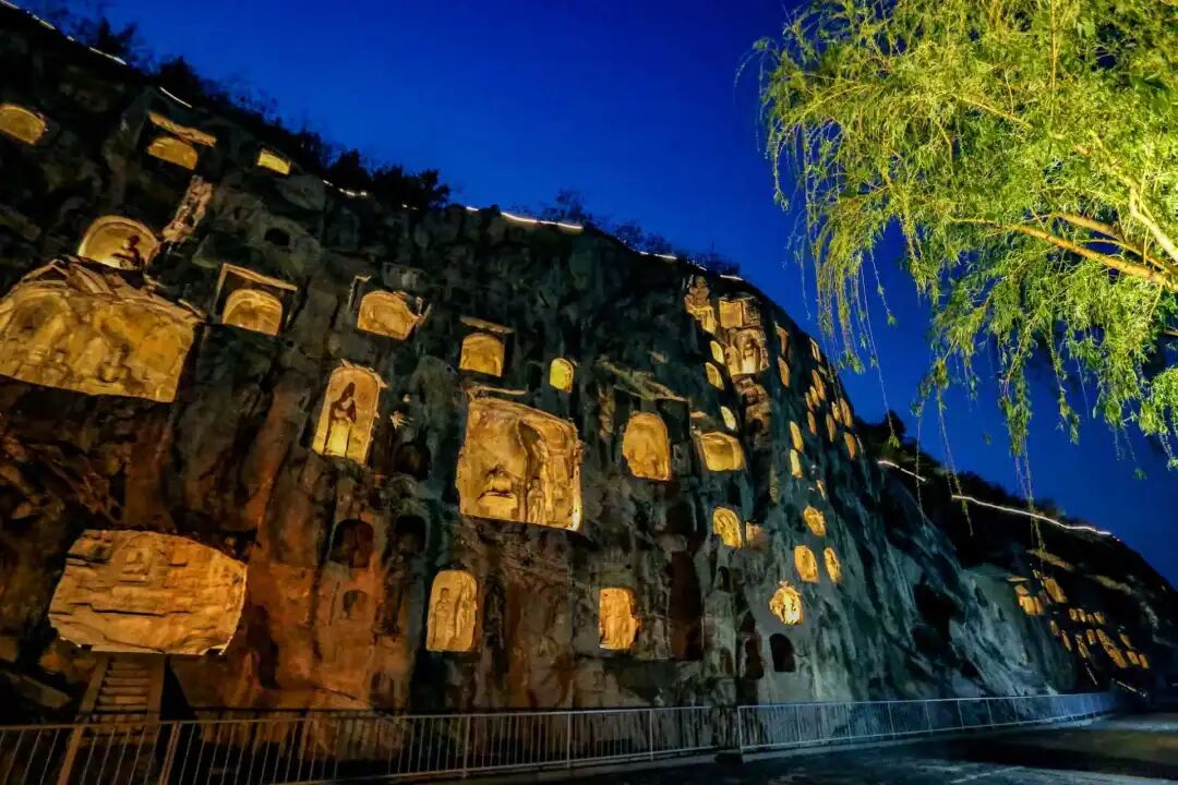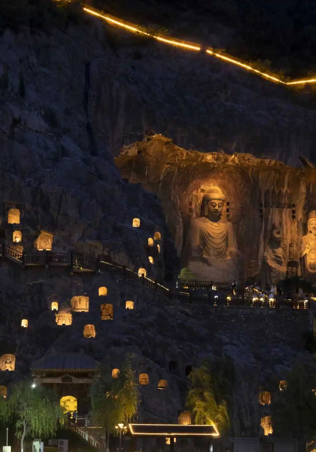 夜游龙门石窟,在石窟内规模最大、最精美的大型群雕造像——卢舍那大像龛前。