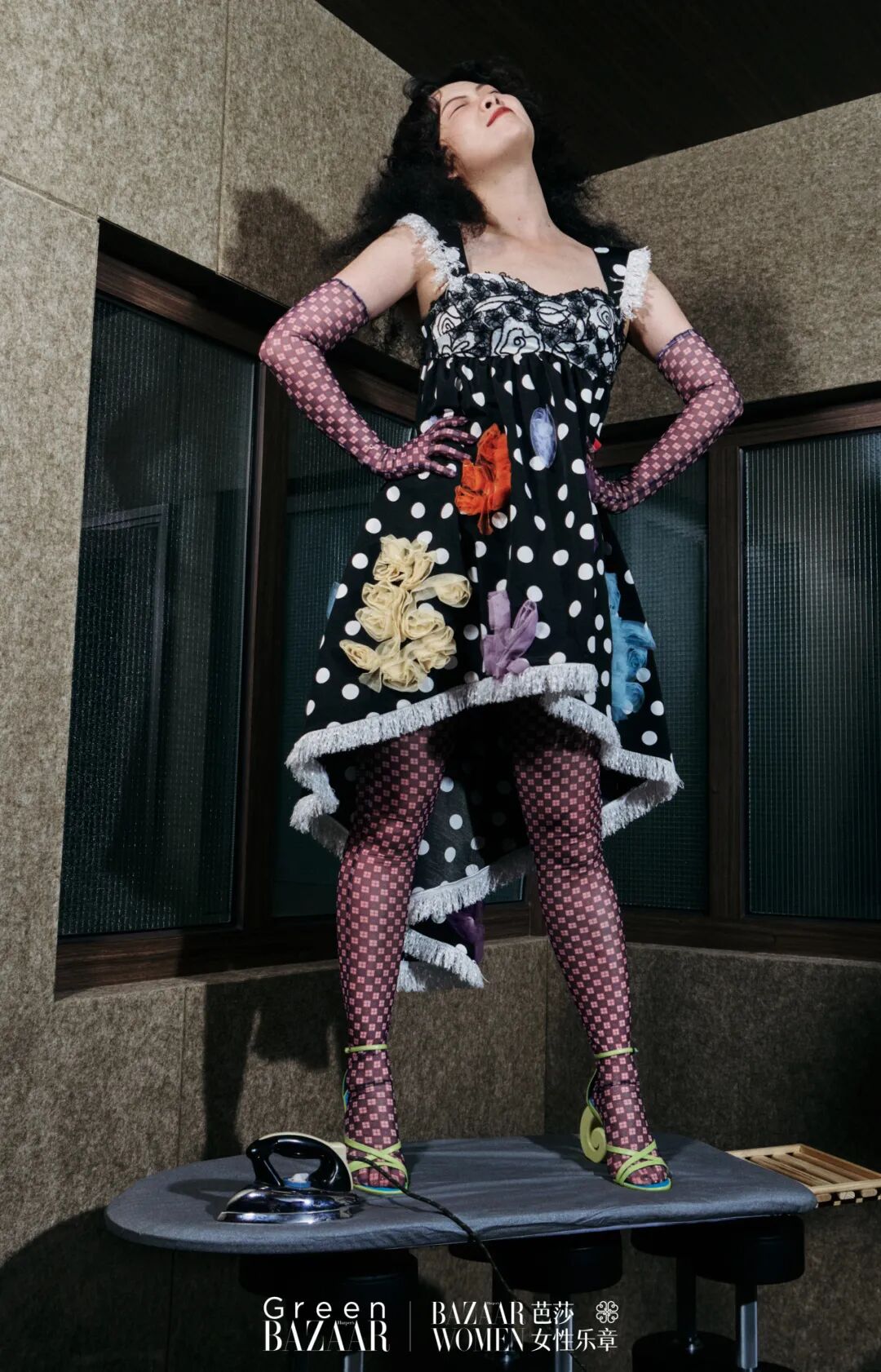 波点长裙、印花手套、印花连腿袜、绑带高跟鞋 均为SHUTING QIU