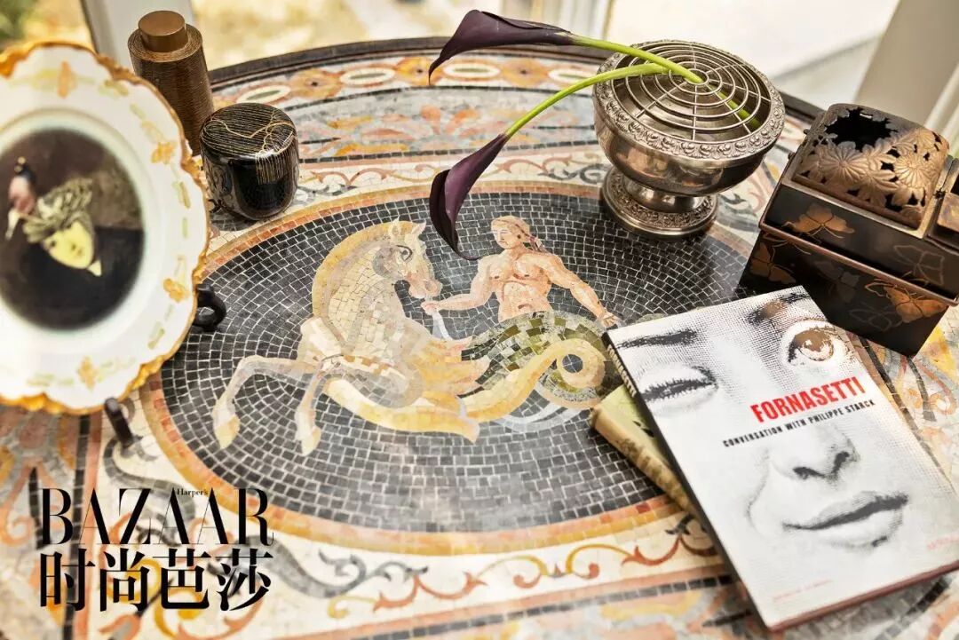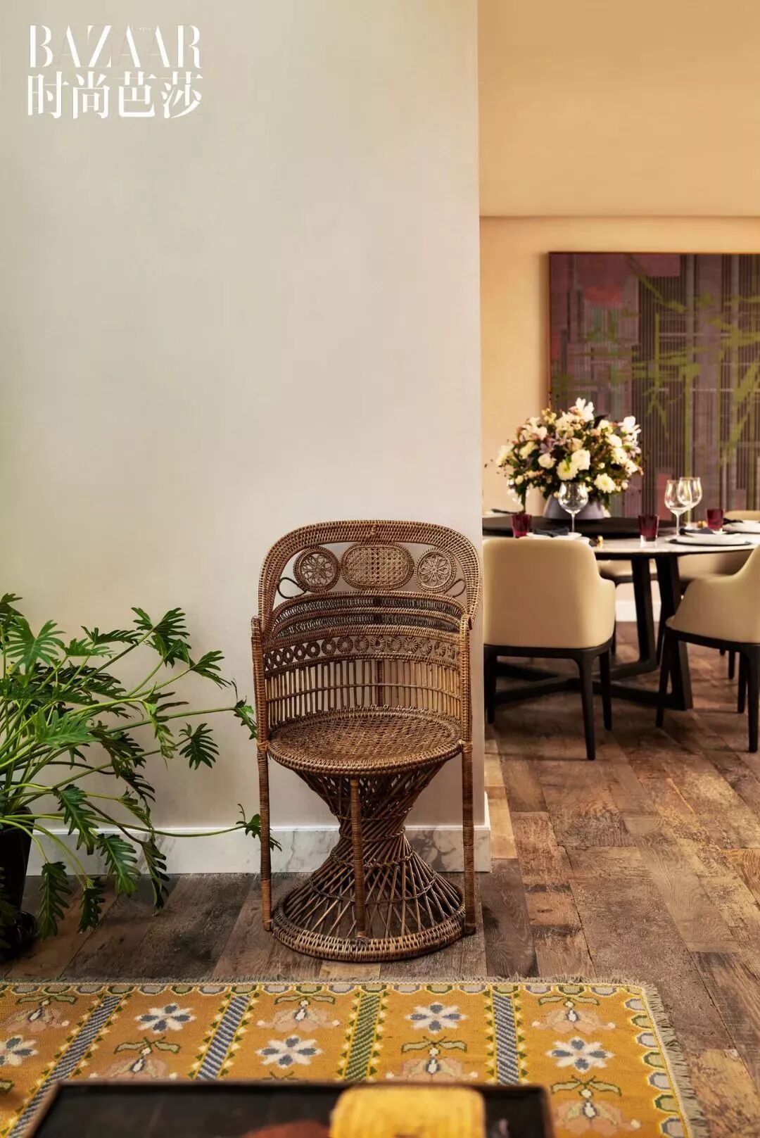 花纹繁复、结构经典的古着家具是蝶居的另一大亮点。尤其是一张来自意大利1920年代的大理石拼花方桌,由十几种不同的意大利大理石镶嵌工艺制成生动的花鸟图案,精美绝伦。坐在这里,能慵懒地享受到从落地玻璃窗洒进阳光的下午茶。这里还是应翠剑画图与寻找灵感的神奇之所:古老历史,美好自然,自我的小宇宙在此汇聚碰撞,带来无限灵感。下午茶区域隔壁是中餐厅,应翠剑还设计了一个细节精巧的圆桌,令聚会拥有更好的交流氛围。