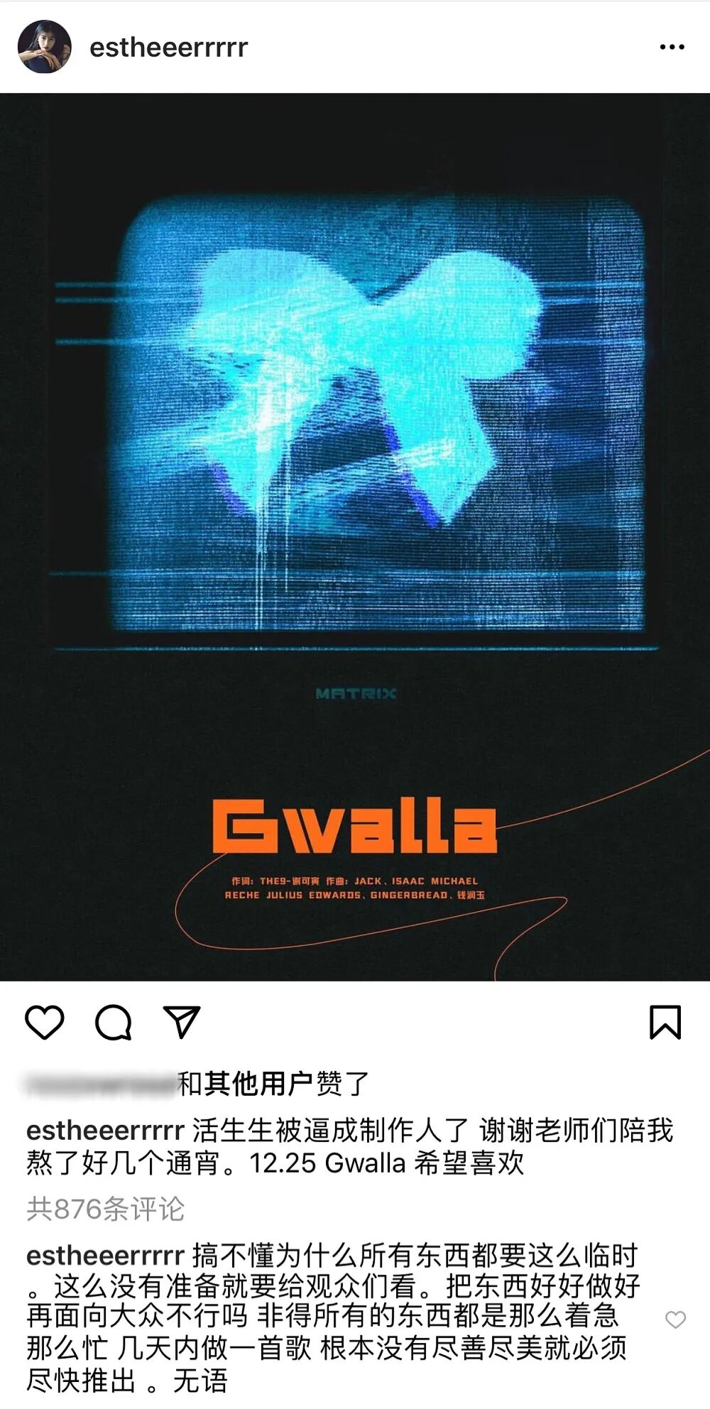 最近THE-9团体要发新专辑,忙着录歌练舞的虞书欣,昨天忍不住在ins上抱怨团队不够用心。“把东西做好再面向大众不行吗?非得所有东西都那么着急那么忙,几天内作一首歌,根本没有尽善尽美就必须尽快推出,无语。”
