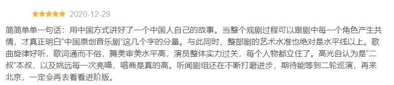 对于这部剧,看过的网友也给出了很高的评价:“用中国方式讲好了一个中国人自己的故事。当整个观剧过程可以跟剧中每一个角色产生共情,才真正明白‘中国原创音乐剧’这几个字的分量。”