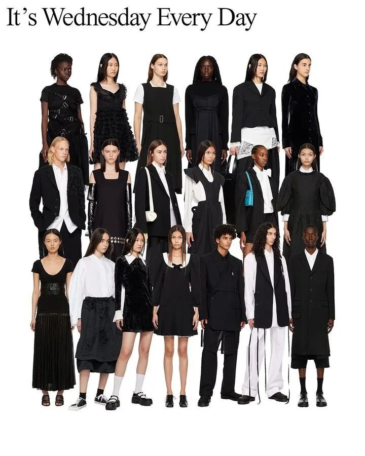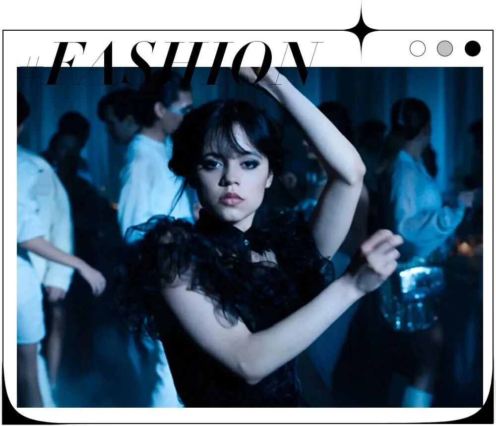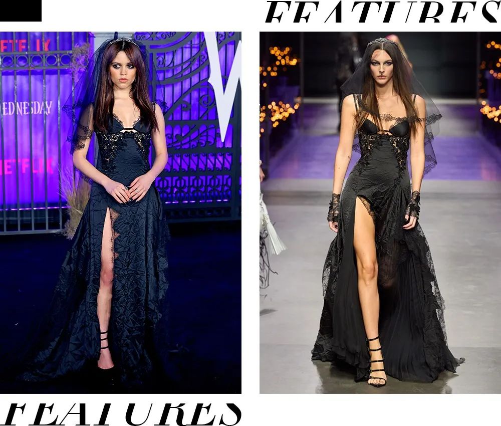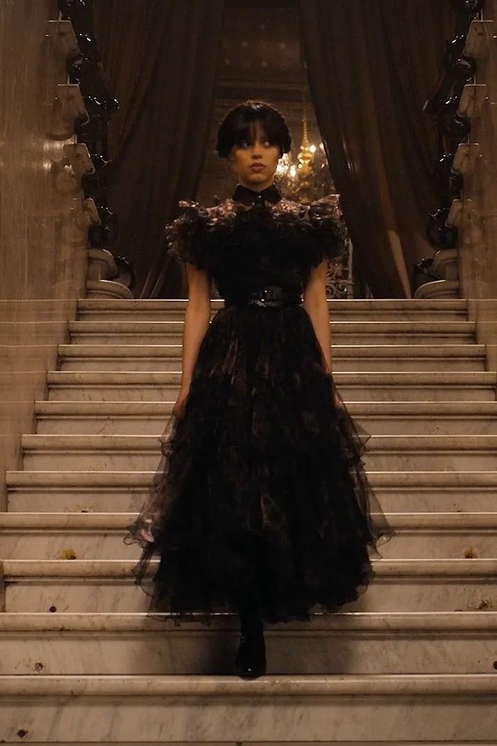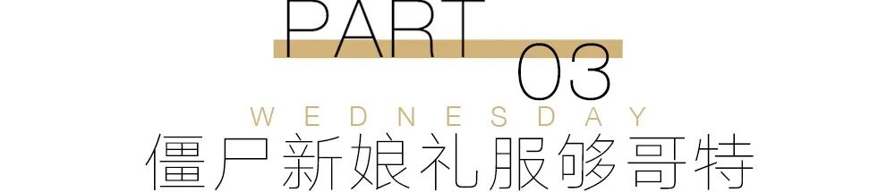 剧中女主角星期三暗黑哥特式的衣品一下就戳中了年轻人要特立独行,又要有点丧的时装风格。“色彩有罪,黑白至上”是星期三的穿衣原则。
