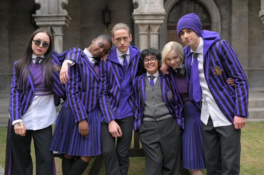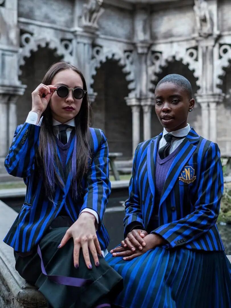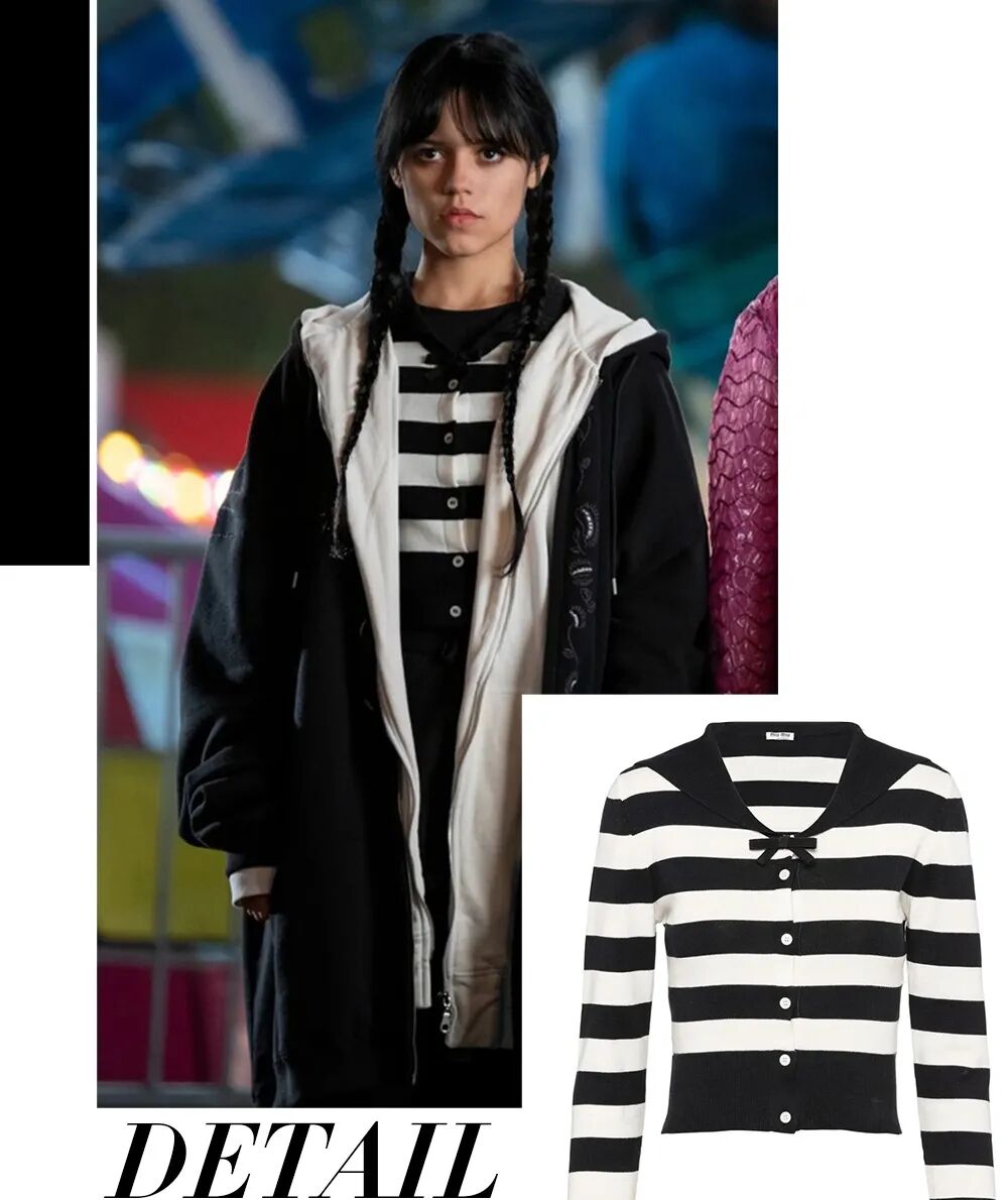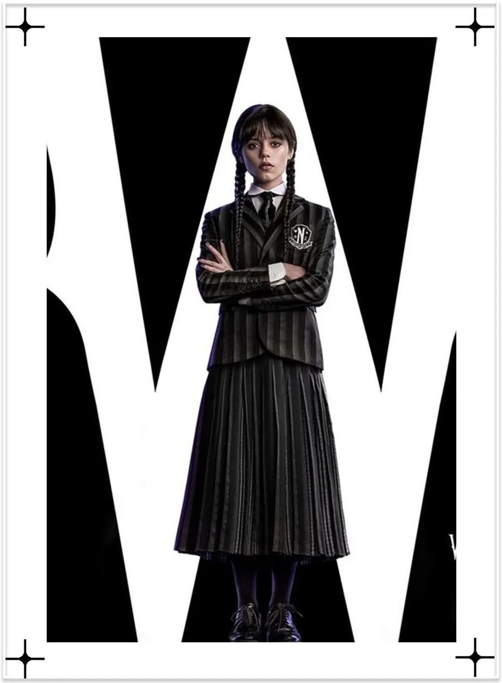 星期三特制的黑灰色条纹制服灵感来自英国校服,但增加了一些现代风格在其中。条纹的加入让校服看起来更加具有戏剧性,内搭衬衫的彼得潘领比起传统衬衫领看起来更加俏皮,加长的裙摆让造型更有宗教感。