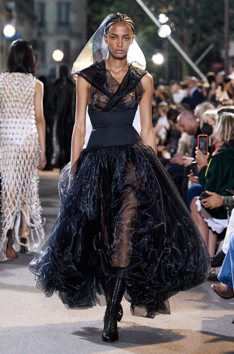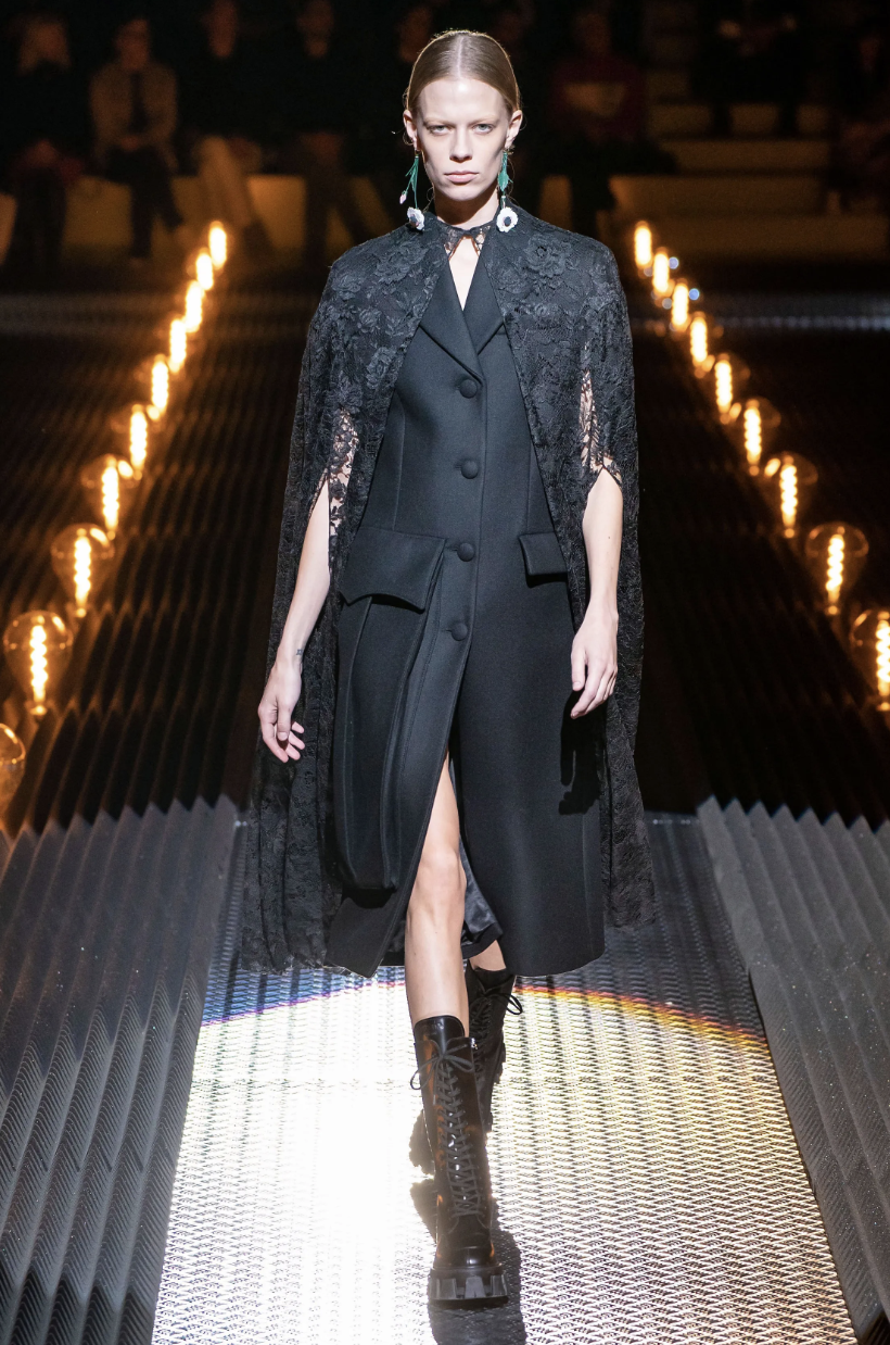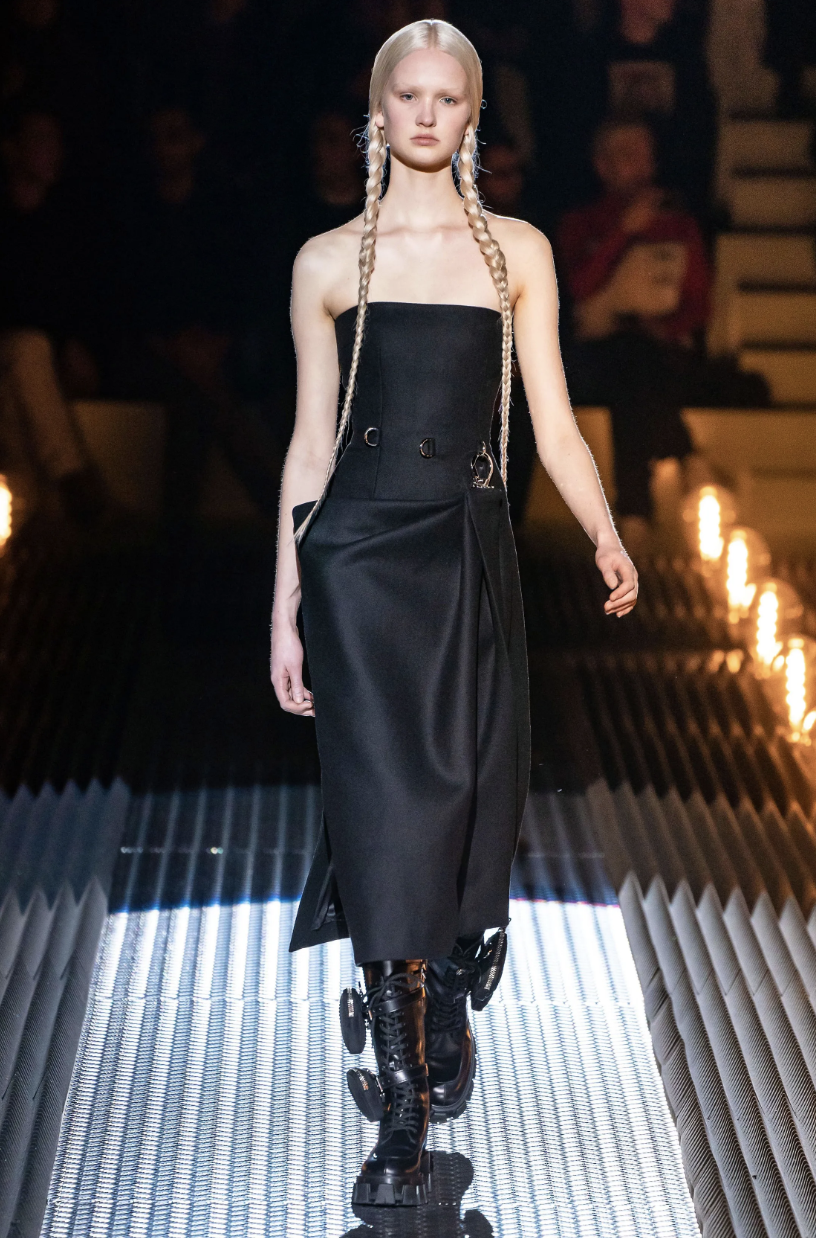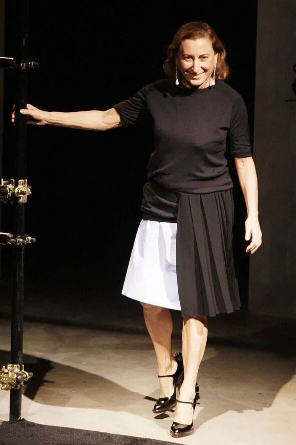 日常穿搭中在all black look中用白色增加视觉效果的示范,就可以学习一下Miuccia本人。如何在全黑造型中让白色出现得恰如其分,需要对时装结构的把握。
