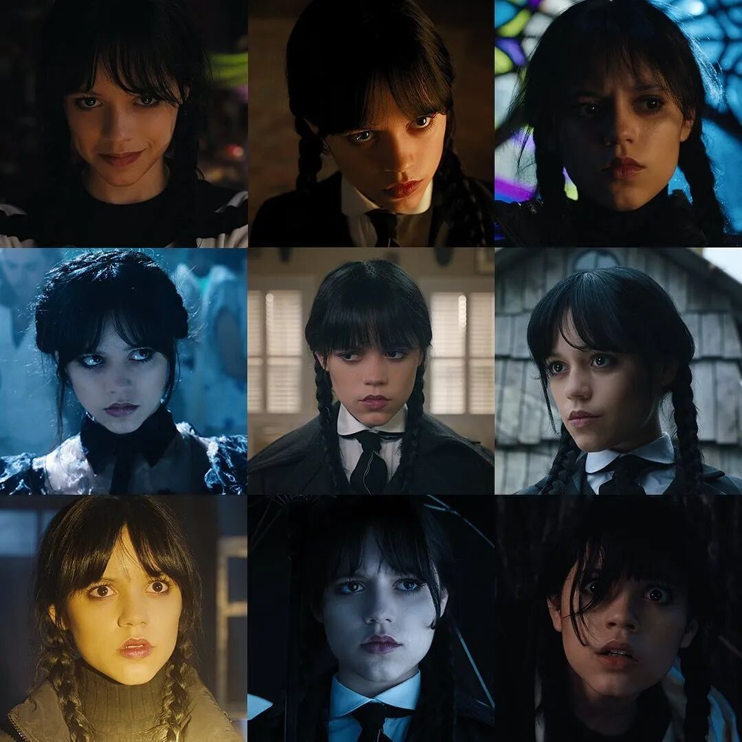 制服、黑色长袖连衣裙、夸张的白色Pilgrim Collar还有双麻花辫,这就是经典的星期三·亚当斯风格。