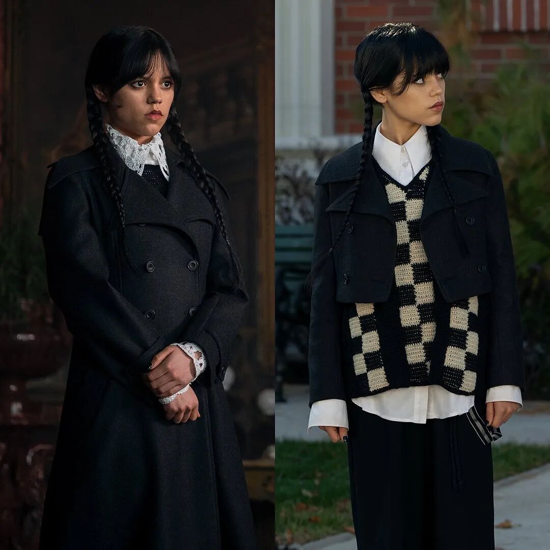 星期三的休闲装是跟以往版本的星期三最大的不同之处,棋盘格毛衣搭配夹克或是帽衫下的条纹衫都让《Wednesday》版本的星期三看起来既哥特又绝对年轻化,仿佛这就是一个生活在2022年的哥特女孩的衣橱。