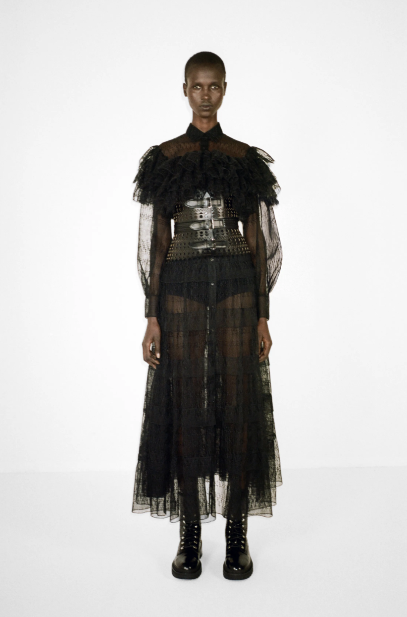 Miu Miu对于Miuccia来说,就是她少女时期的样子,优雅又野性,绝不循规蹈矩。星期三造型中的Miu感来自于黑色中少女感元素的加入,比如可爱的彼得潘领、缎面碎花和改良后的玛丽珍鞋。