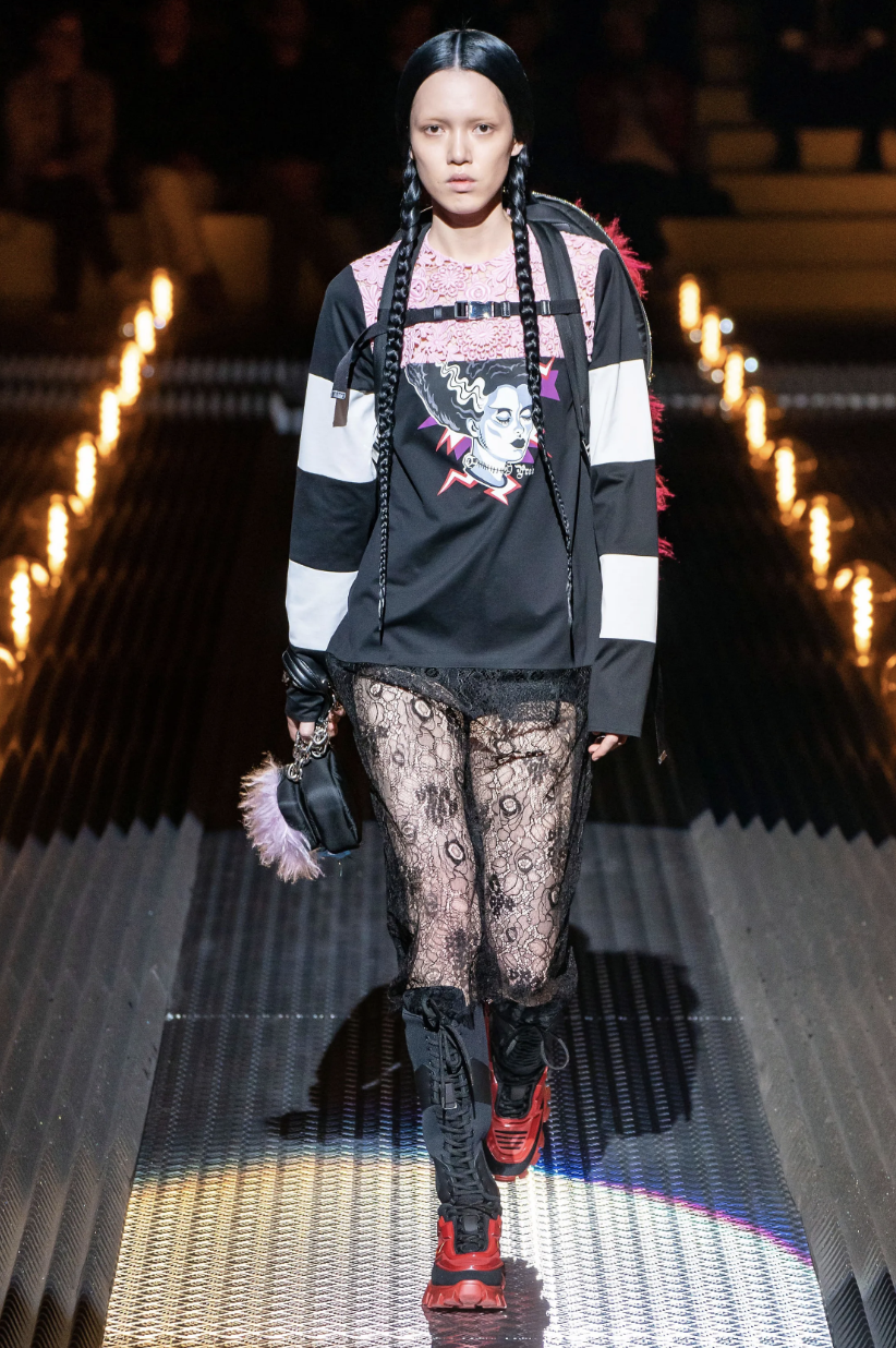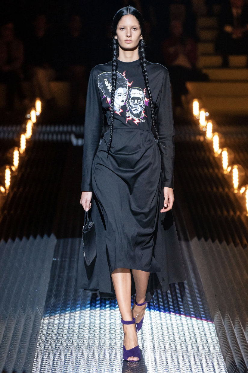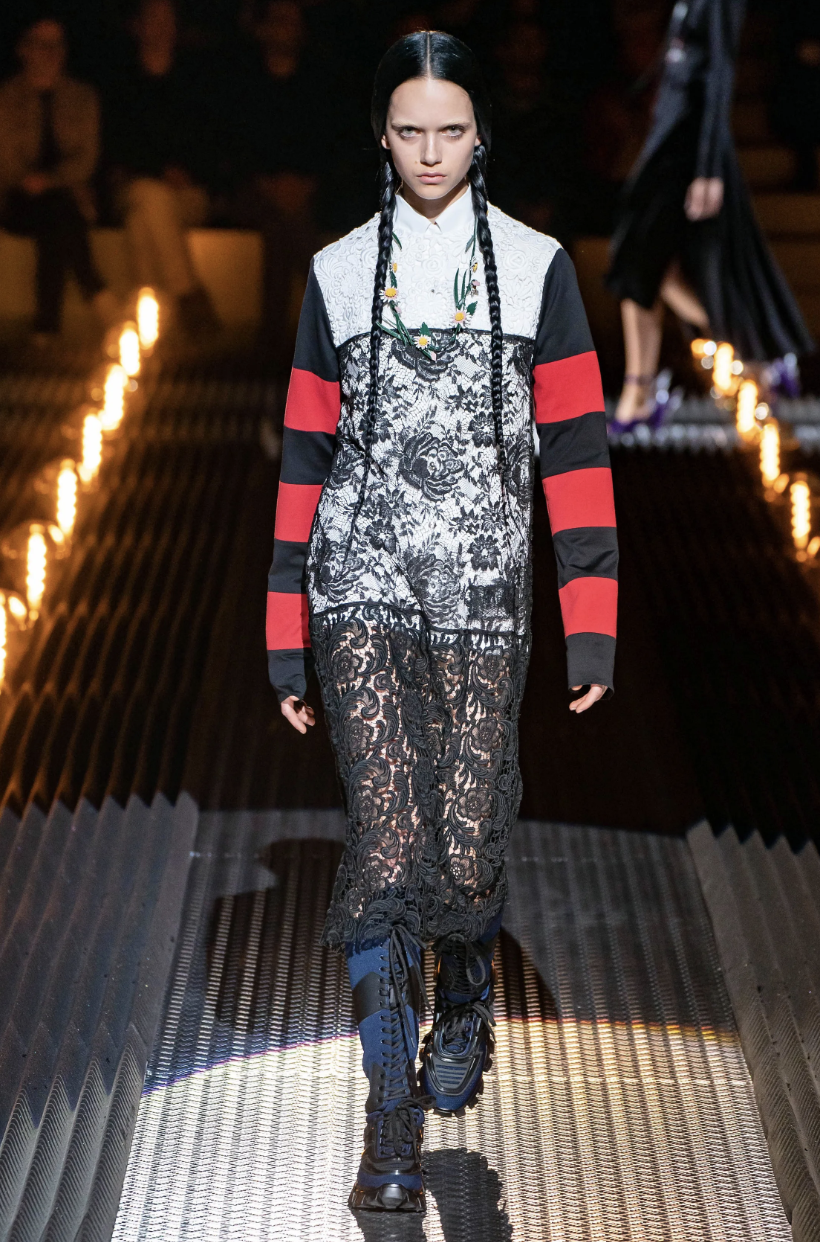 Prada 2019秋冬系列就以《亚当斯一家》为灵感,用大量黑色、条纹、蕾丝和3D缎面花朵打造出暗黑童话式的浪漫。横条纹搭配厚底机车靴,抑或是制服式的西装裙,这一季Miuccia将哥特浪漫主义演绎得足够酷。