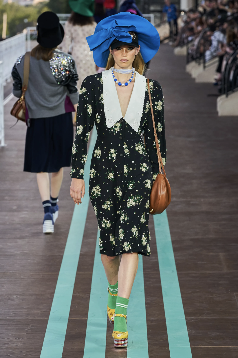 在整体暗色造型的基础上利用碎花、波点、条纹、翻领等元素正是Miu Miu的搭配思路。