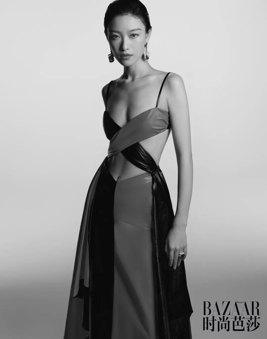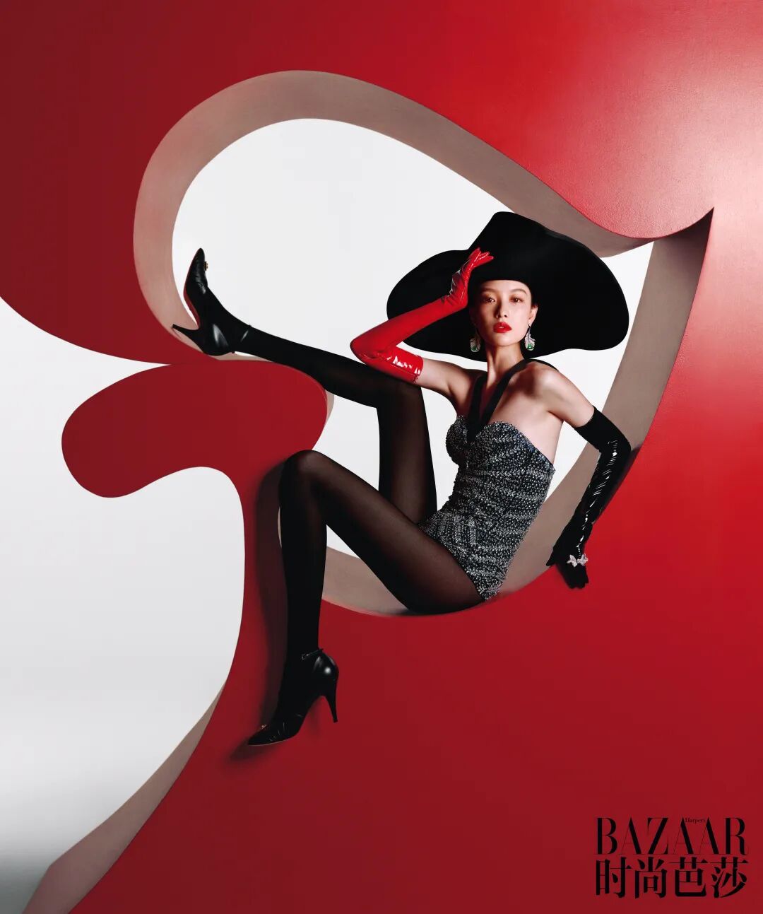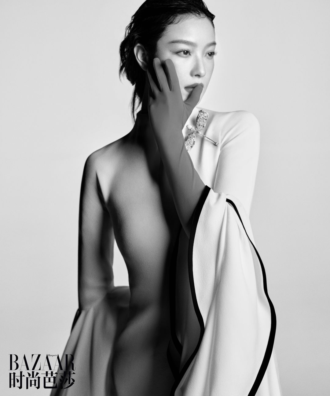 亮钻连身挂脖抹胸、手套、帽子、高跟鞋均为Gucci 缎带系列白钻缎带戒指 CINDY CHAO艺术珠宝
